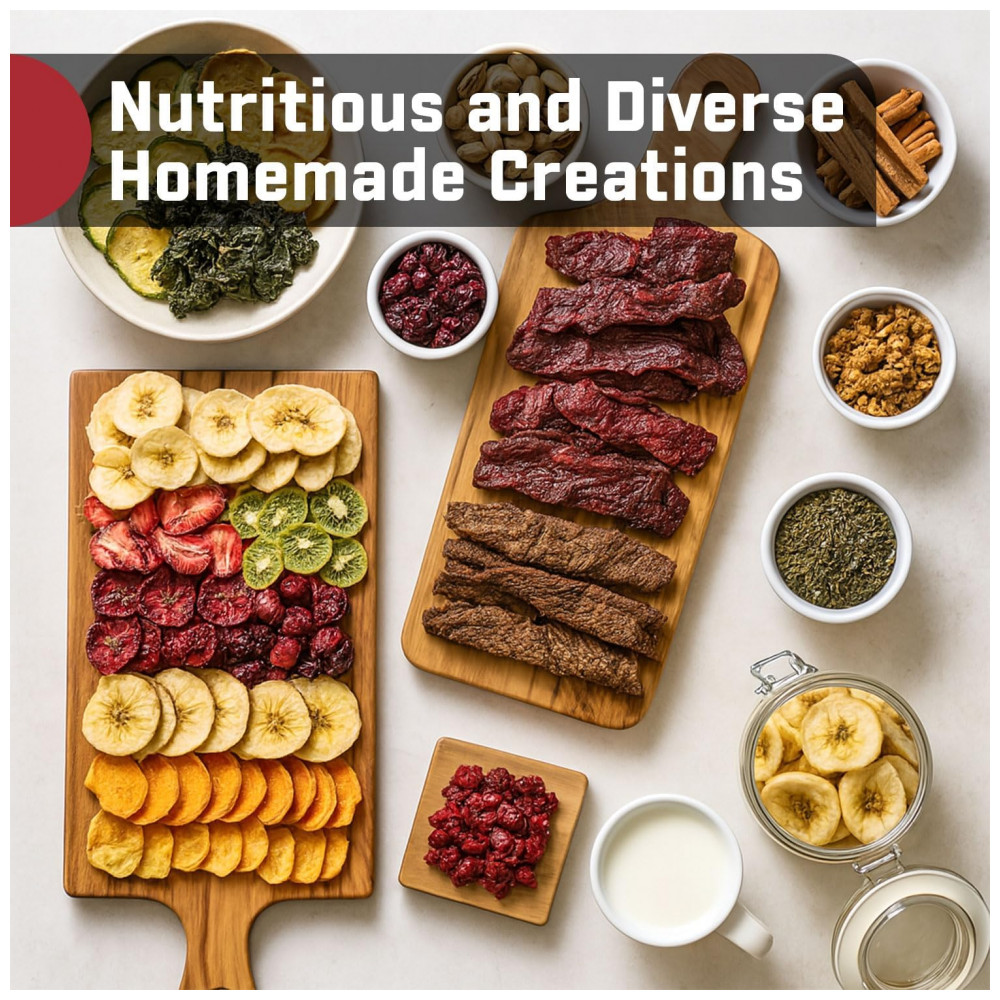 O desidratador de alimentos HOPERAN com 10 bandejas em aço inoxidável 100% grau alimentício oferece alta capacidade para secagem eficiente de carnes, frutas, legumes e petiscos. Conta com controle digital preciso, timer ajustável de até 24 horas e ajuste de temperatura entre 29°C e 90°C, com funcionamento silencioso abaixo de 45 dB. Equipado com sistema de dupla ventoinha e circulação de ar 360°, garante secagem rápida e uniforme. O design moderno inclui porta de vidro para fácil visualização e bandejas seguras para lava-louças, facilitando a limpeza. Acompanha acessórios como bandeja coletora, telas de malha, folha para rolo de frutas e manual com receitas.