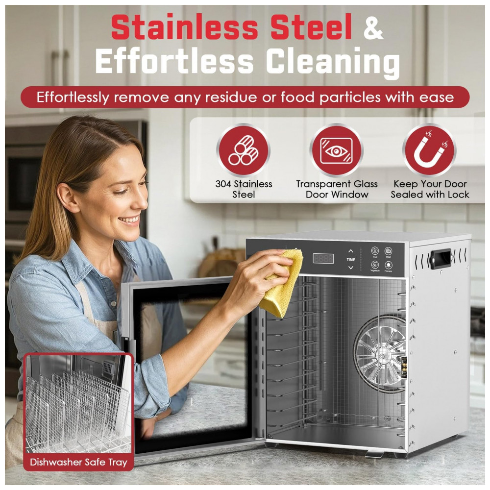 Desidratador HOPERAN Inox 800W com 10 Bandejas Controle Digital Timer Ajustável e Fluxo de Ar 360° para Carnes Frutas e Legumes