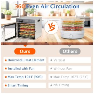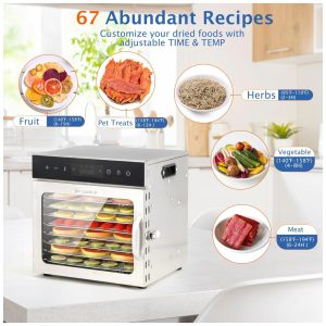 O Desidratador de Alimentos Oritouchpop é ideal para desidratar frutas, ervas, carnes, vegetais e petiscos para cães. Com 8 bandejas de aço inoxidável, oferece uma grande capacidade de secagem. O controle de temperatura ajustável até 90°C e o temporizador de 24 horas garantem resultados precisos e consistentes. A tecnologia de circulação de ar quente 360° e o ventilador de exaustão garantem uma secagem uniforme e eficiente.