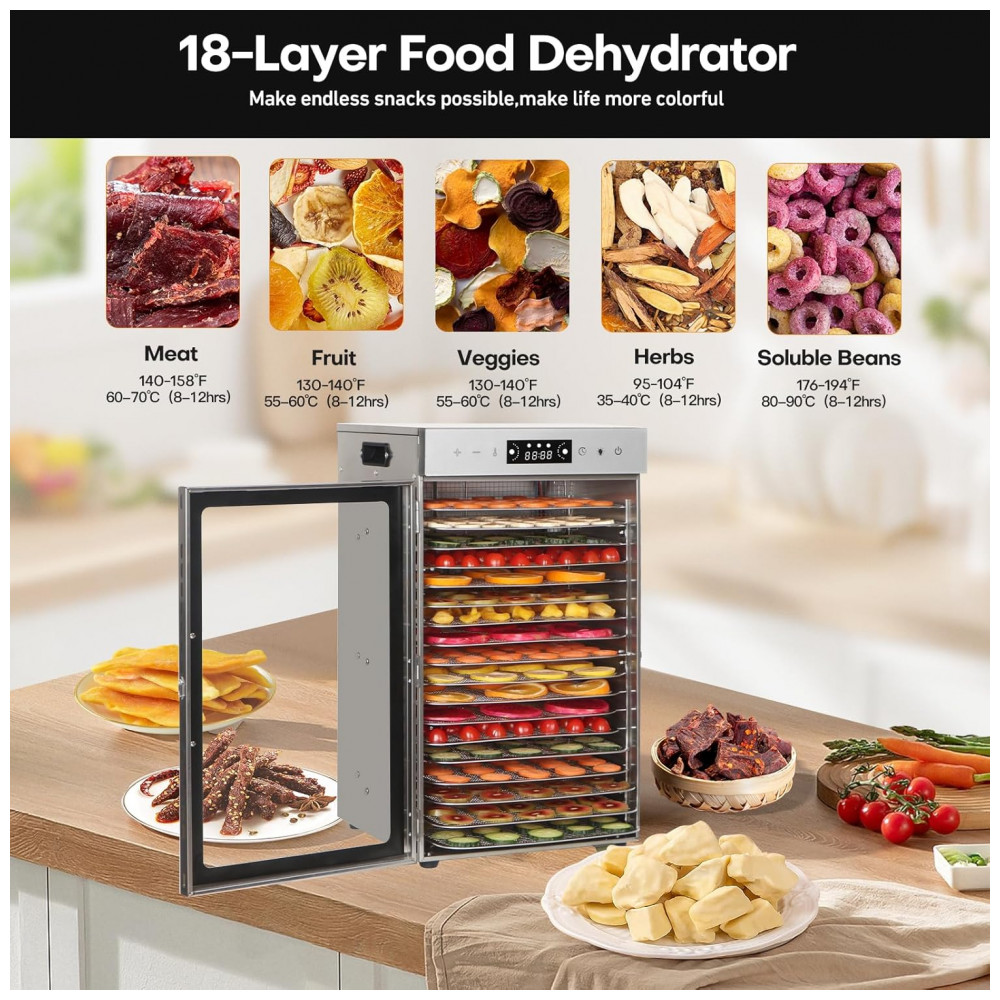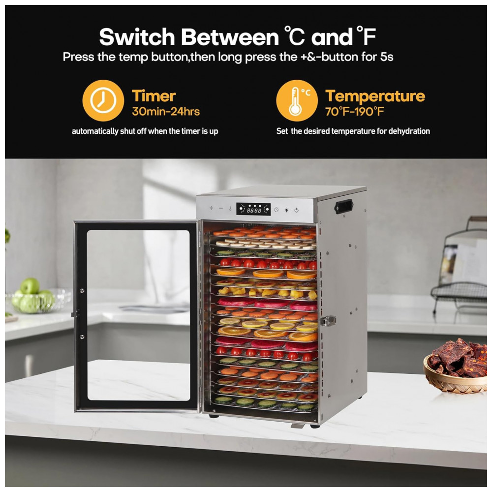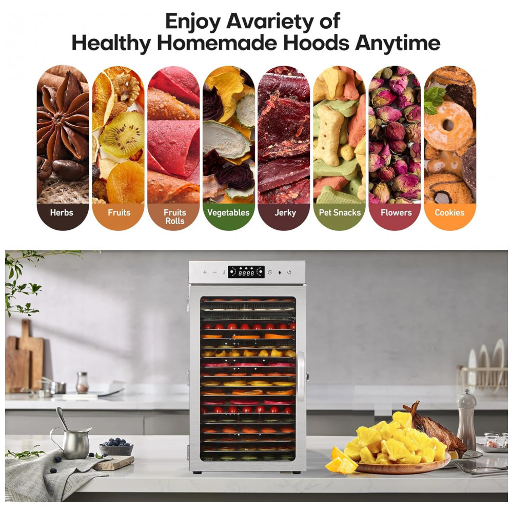 O Desidratador de Alimentos Panana é a escolha perfeita para quem busca praticidade e eficiência na secagem de alimentos. Com duas potentes ventoinhas circulando ar quente a 360 graus, este desidratador garante uma secagem rápida e uniforme de carnes, frutas e vegetais. Suas 18 bandejas de aço inoxidável com tamanho ideal são perfeitas para reuniões familiares ou festas. Fácil e seguro de usar, conta com painel de controle digital com timer e controle de temperatura, que pode ser ajustado de 70 a 190 graus Fahrenheit. Além disso, possui proteção contra superaquecimento, garantindo a segurança do processo. Com estrutura em aço inoxidável durável, é fácil de limpar e as bandejas podem ir à lava-louças. Silencioso, com 800W de potência, o desidratador possui janela transparente e luzes de LED para acompanhar o processo de secagem. O pacote inclui 1 máquina, 18 bandejas, 1 bandeja de gotejamento, 1 livro de receitas e 1 manual de instruções. O livro de receitas oferece diversas opções de petiscos desidratados. Surpreenda sua esposa, amigo ou amante da culinária com este desidratador de alimentos, um presente ideal para o Natal.