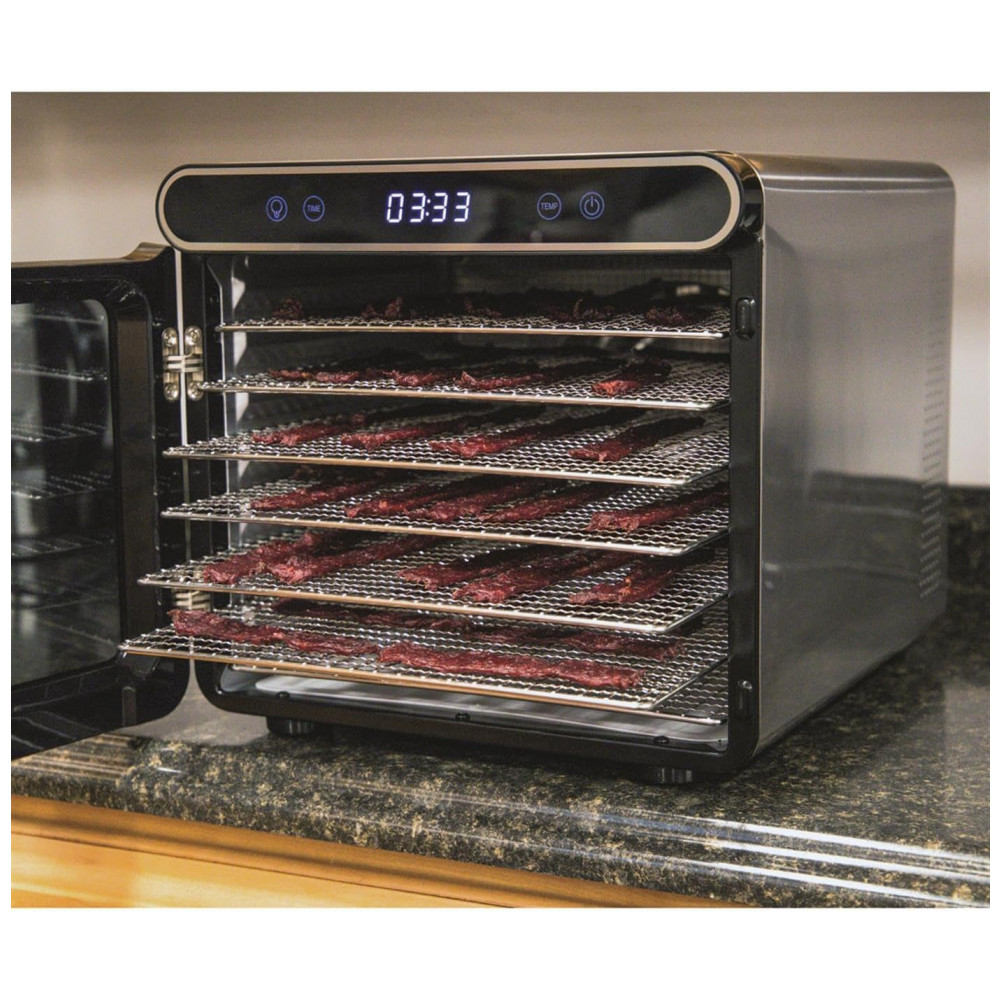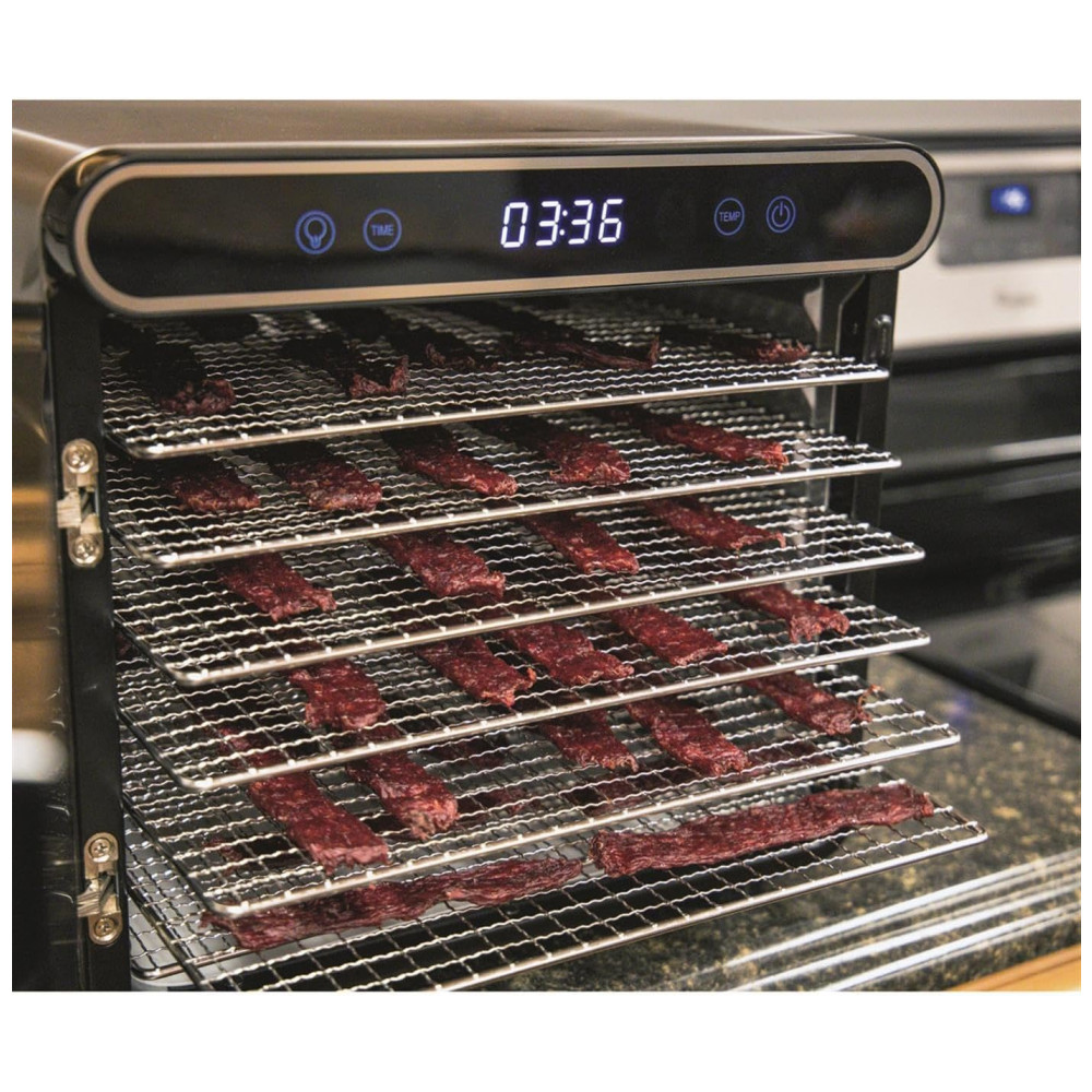 FÁCIL DE USAR: O interior é todo em metal, o que facilita a limpeza e garante a máxima retenção de calor ao preparar carne seca, couro de frutas, frutas secas, petiscos para cães e muito mais.