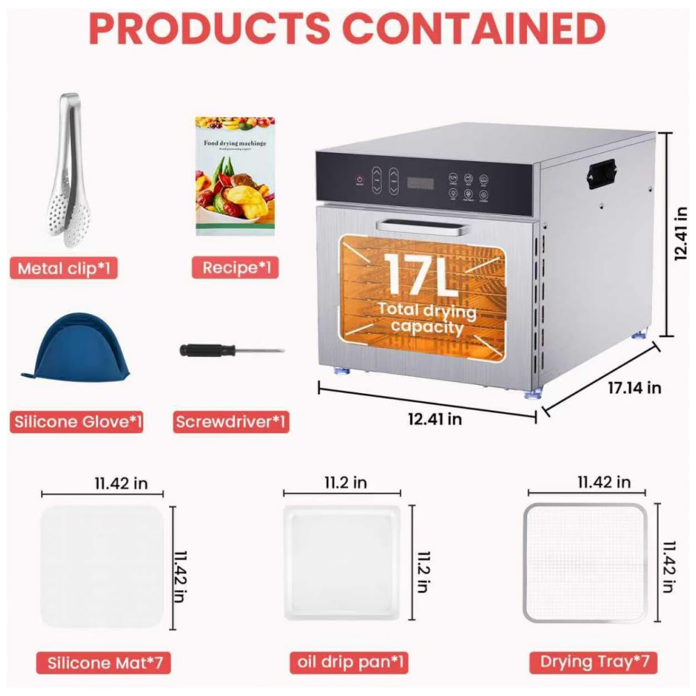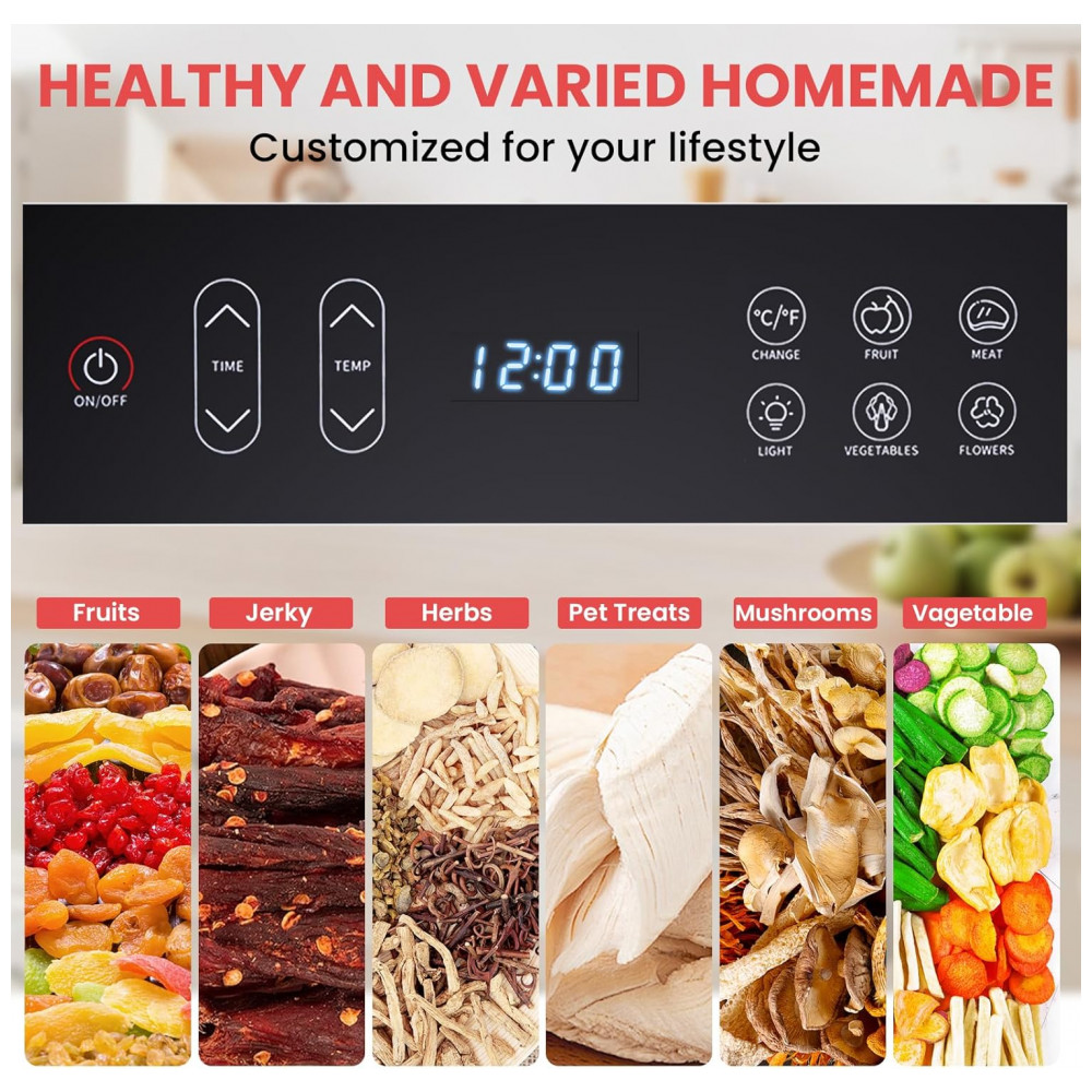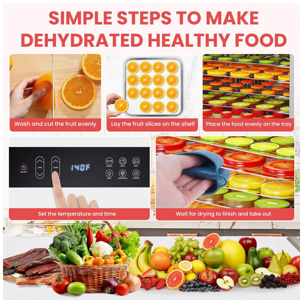 Preserve o Sabor e os Nutrientes Este desidratador de alimentos elétrico é impulsionado por um motor de 600W, equipado com um ventilador de secagem traseiro e tecnologia de circulação de ar de 360 para distribuição de calor uniforme e processo eficiente de secagem de alimentos, garantindo a máxima preservação de vitaminas, minerais e sabores naturais. A porta de janela transparente permite monitorar facilmente o processo de secagem dos alimentos a qualquer momento. Controle Preciso de Temperatura e Temporizador O desidratador de alimentos para jerky possui uma faixa de temperatura de 30 a 90,4°C e um ajuste de tempo de até 124 horas, permitindo definir com precisão o tempo e a estabilidade de desidratação, se adaptando às diferentes necessidades dos alimentos para obter resultados perfeitos. Função de desligamento automático integrada, interrompe automaticamente a operação após o término do processo de desidratação, garantindo segurança e confiabilidade. 7 Bandejas Grandes O desidratador de alimentos comercial possui 7 camadas de bandejas de alimentos de aço inoxidável 29×29 cm, proporcionando amplo espaço de secagem para secar alimentos de tamanhos diferentes ao mesmo tempo, adequado para uso doméstico ou pequeno comercial. Nossa máquina desidratadora de alimentos também vem com 7 Bandejas de Secagem, 7 Tapetes de Silicone, 1 Bandeja de Gotejamento de Óleo, 1 Chave de Fenda, 1 Grampo de Metal, 1 Luva de Silicone, 1 Manual de Instruções, 1 Receita. Ultra-Silencioso e Proteção de Segurança Nosso desidratador de carne de aço inoxidável possui um design ultra-silencioso, não faz barulho mesmo se funcionar por um longo período. É adequado para uso doméstico e proporciona um processo de secagem tranquilo. O desidratador de frutas possui proteção contra superaquecimento integrada. Se a temperatura da máquina estiver muito alta, o sistema irá parar automaticamente para garantir sua segurança. Por favor, use luvas de silicone para tocar na bandeja e evitar queimaduras. Fácil de Usar e Limpar O desidratador de alimentos e jerky é feito de aço inoxidável de grau alimentício e uma porta frontal de vidro, sendo durável, fácil de limpar e pode ser usado por um longo período. A bandeja removível facilita a limpeza. O desidratador de alimentos digital pode ser usado para secar jerky, carne, ervas, vegetais, frutas, cereais, cascas, migalhas de pão, etc., mantendo a nutrição e o sabor, e melhorando seu estilo de vida saudável.