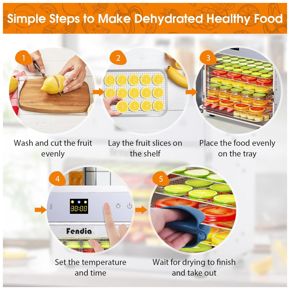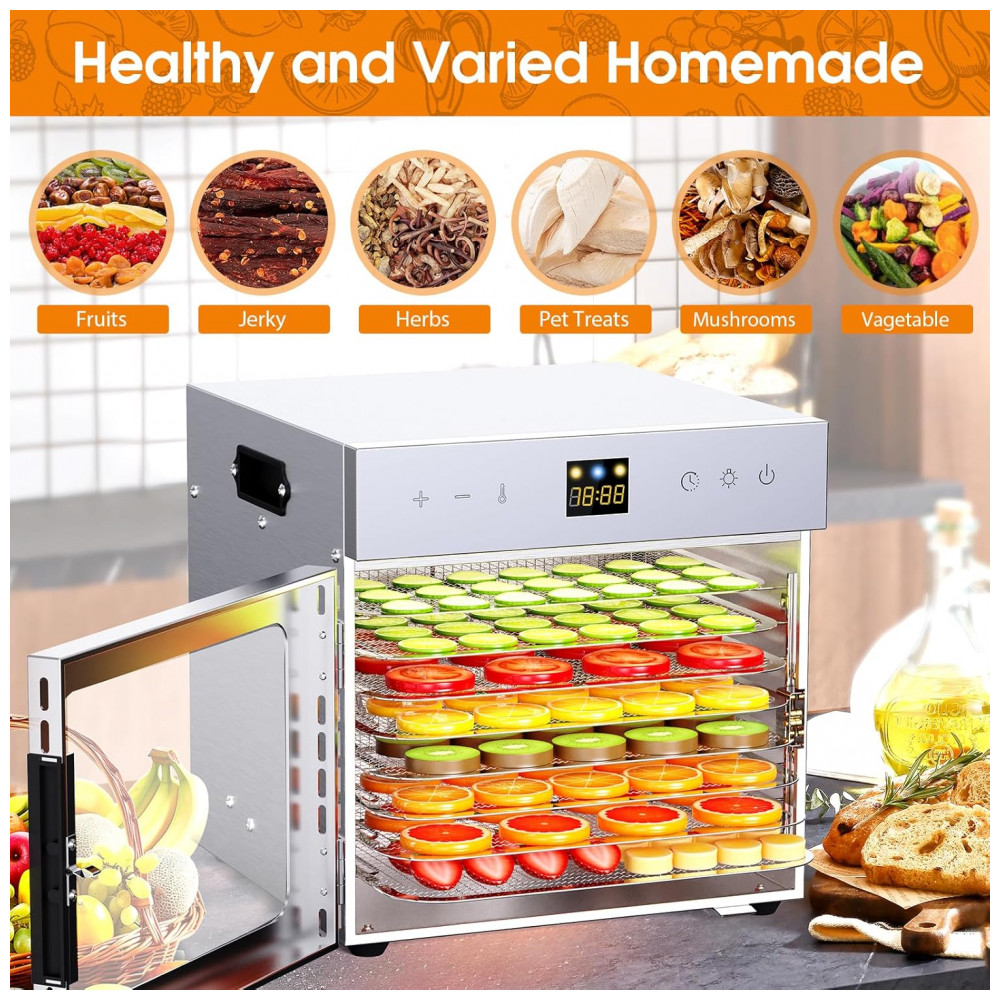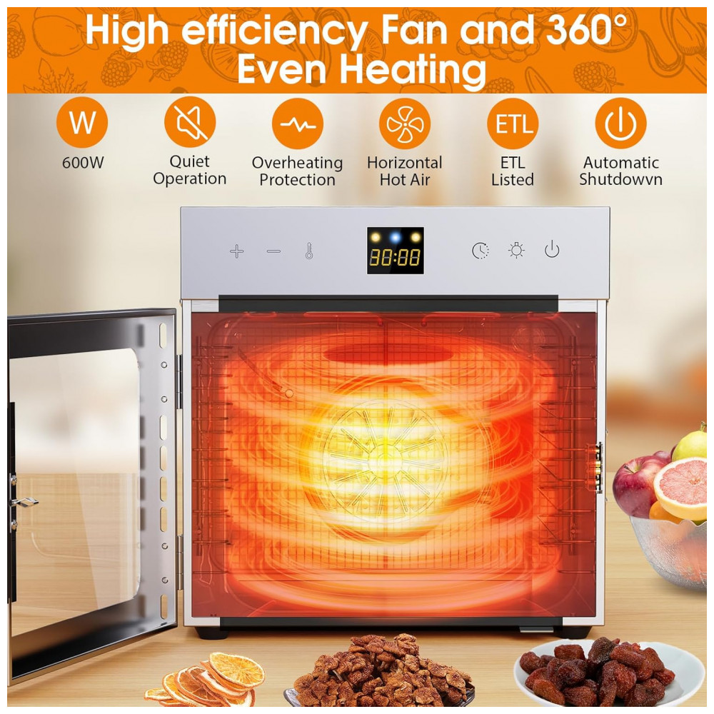 Preserve o Sabor e a Nutrição com este desidratador de alimentos elétrico impulsionado por um motor de 600W, equipado com um ventilador traseiro e tecnologia de circulação de ar de 360, garantindo distribuição uniforme de calor e um processo eficiente de secagem de alimentos, assegurando a preservação máxima de vitaminas, minerais e sabores naturais dos alimentos. A porta de vidro transparente permite monitorar facilmente o processo de secagem dos alimentos a qualquer momento. Controle Preciso de Temperatura e Timer: O desidratador de alimentos para jerky possui uma faixa de temperatura de 30 a 88 graus Celsius e um timer de até 124 horas, permitindo ajustar com precisão o tempo de desidratação e estabilidade, adaptando-se às diferentes necessidades de alimentos para obter resultados perfeitos. Possui função de desligamento automático integrada, parando automaticamente após o término do processo de desidratação, garantindo segurança e confiabilidade. 8 Bandejas: O desidratador comercial possui 8 camadas de bandejas de alimentos em aço inoxidável de 28x20cm, oferecendo amplo espaço para secar alimentos de tamanhos diferentes ao mesmo tempo, adequado para uso doméstico ou pequeno comercial. A máquina de desidratar alimentos também vem com 1 bandeja de gotejamento, 8 tapetes de silicone, 1 bandeja de gotejamento de óleo, 1 chave de fenda, 1 clipe metálico, 1 luva de silicone, 1 manual de instruções, 1 receita. Ultra Silencioso e Proteção de Segurança: Nosso desidratador de carne em aço inoxidável possui um design ultra silencioso, não emitindo ruídos perturbadores mesmo após longos períodos de funcionamento. É adequado para uso doméstico, proporcionando um processo de secagem silencioso. O desidratador de frutas possui proteção contra superaquecimento integrada. Se a temperatura da máquina estiver muito alta, o sistema para automaticamente para garantir sua segurança. Use luvas de silicone ao tocar a bandeja para evitar queimaduras. Fácil de Usar e Limpar: O desidratador de alimentos e jerky é feito de aço inoxidável de qualidade alimentar e uma porta frontal de vidro, sendo durável, fácil de limpar e podendo ser usado por um longo período. A bandeja removível facilita a limpeza. O desidratador de alimentos digital pode ser utilizado para secar jerky, carne, ervas, vegetais, frutas, cereais, cascas, migalhas de pão, etc., mantendo a nutrição e sabor, e promovendo um estilo de vida saudável.