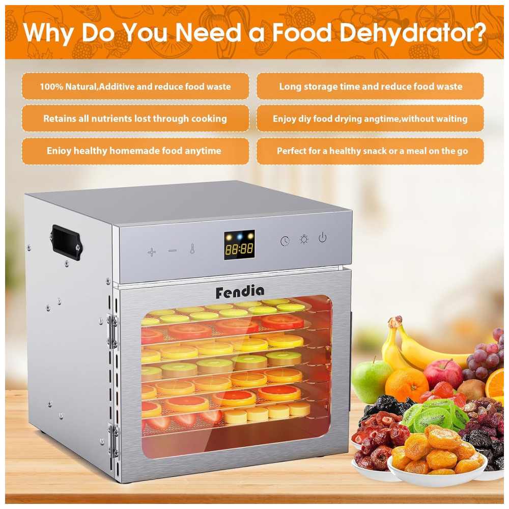 Desidratador de Alimentos para Jerky 8 Bandejas em Aço Inoxidável 600W Timer de 24H e Controle de TemperaturaFendia