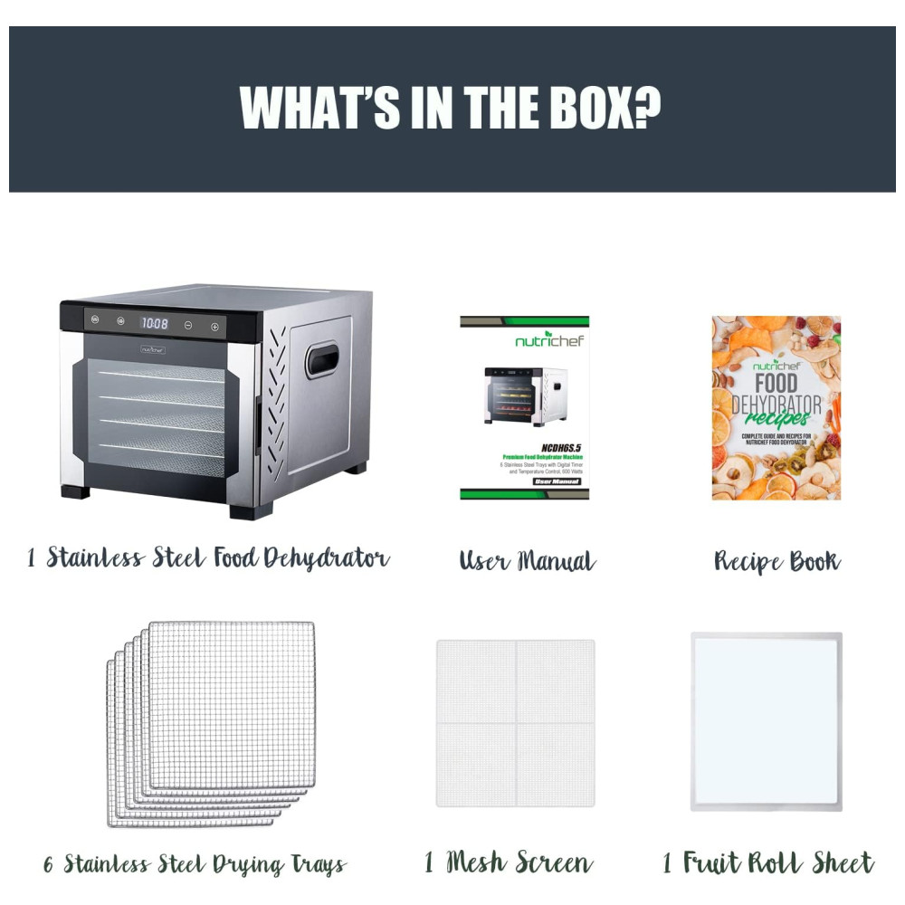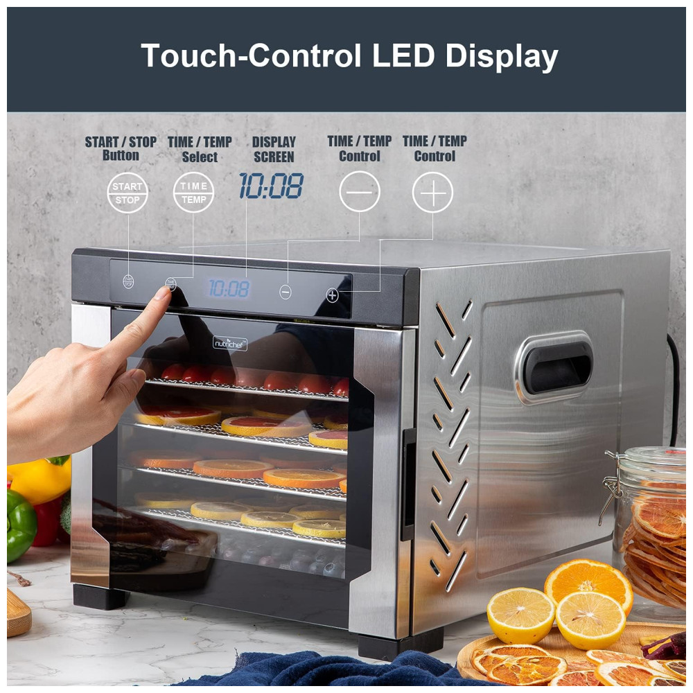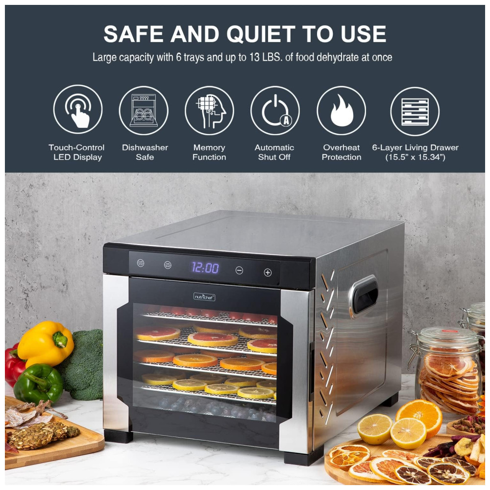 Máquina de desidratação de bancada elétrica NutriChef NCDH6S.5 600 watts Premium Multinível de carne e carne Jerky Maker Maker Secador de frutas , legumes com 6 bandejas de aço inoxidável, PEQUENO, PRETO