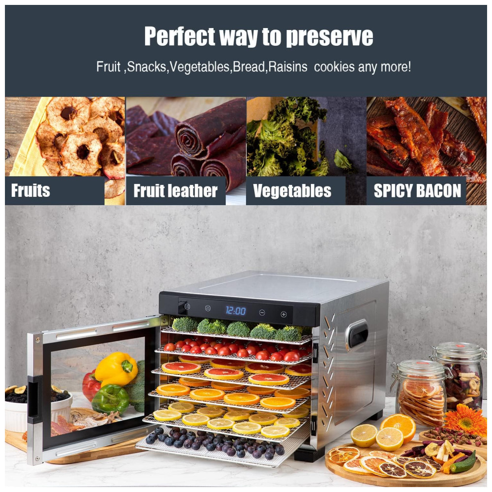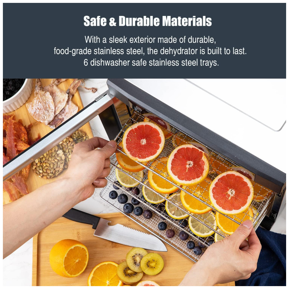 Máquina desidratadora de alimentos premium 6 bandejas de aço inoxidável com temporizador digital e controle de temperatura, 600 Watts Características Porta frontal de aço inoxidável e vidro de qualidade alimentar Gaveta viva de 6 camadas Controle eletrônico de temperatura da sonda e tempo Circulação de ar quente em 360 Indução magnética da porta do interruptor Motor montado na parte traseira e ventilador interno Circulam o ar quente Fácil de zenar e limpar e silencioso de usar Tela LED de controle por toque Segura na máquina de lavar louça Desligamento automático Função de memória Inclui proteção contra superaquecimento Tela de malha incluída e folha de rolo de frutas Livro de receitas grátis com 50 receitas originais Tempo e temperatura ajustáveis Maneira perfeita de conservar frutas, lanches, legumes, pão, flores e muito mais Conteúdo da caixa 1 desidratador de alimentos em aço inoxidável 1 Tela de malha 1 Folha de rolo de frutas 6 Bandejas.