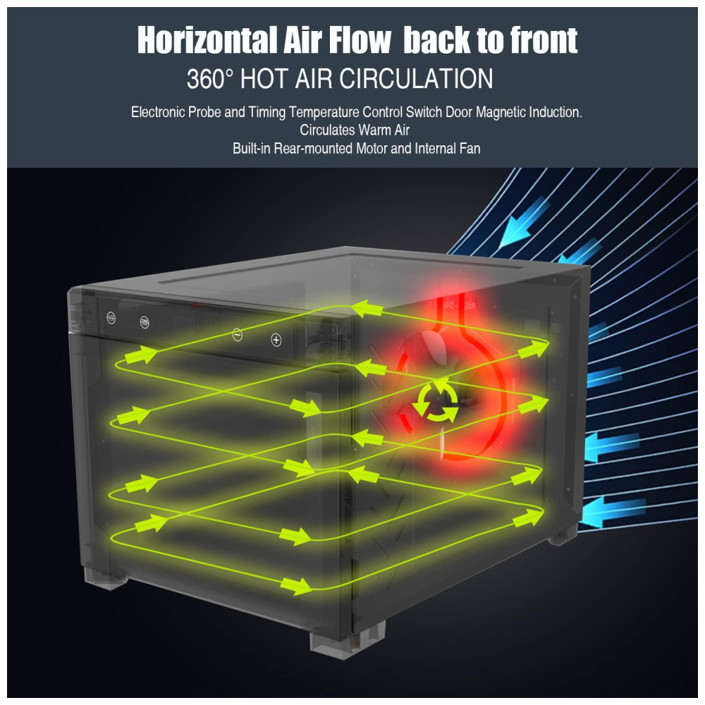 CIRCULAÇÃO DE CALOR ALTO A circulação de ar quente a 360 seca efetivamente os alimentos, removendo o conteúdo de umidade. Encolhe os alimentos, mas ainda retém 97 de vitaminas e minerais. Testado cientificamente para aumentar a vida útil dos alimentos com alta circulação de calor