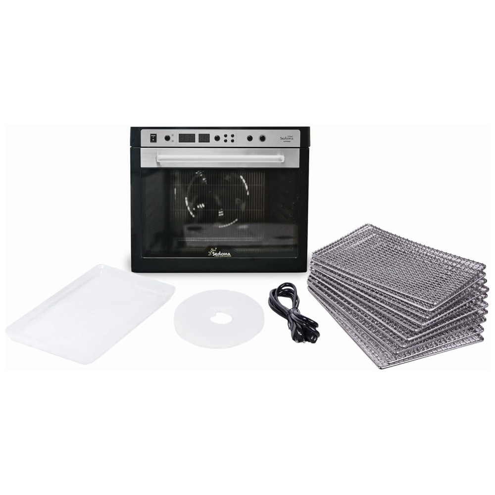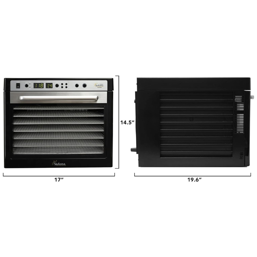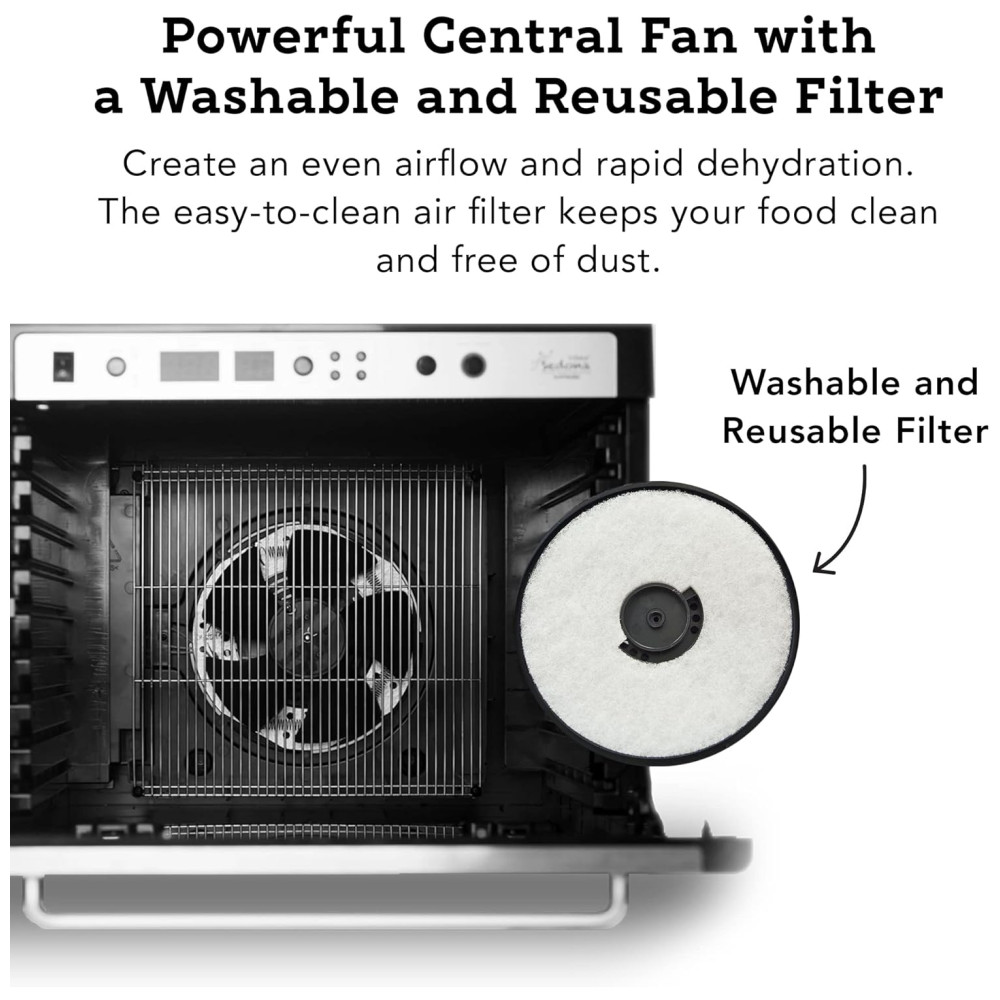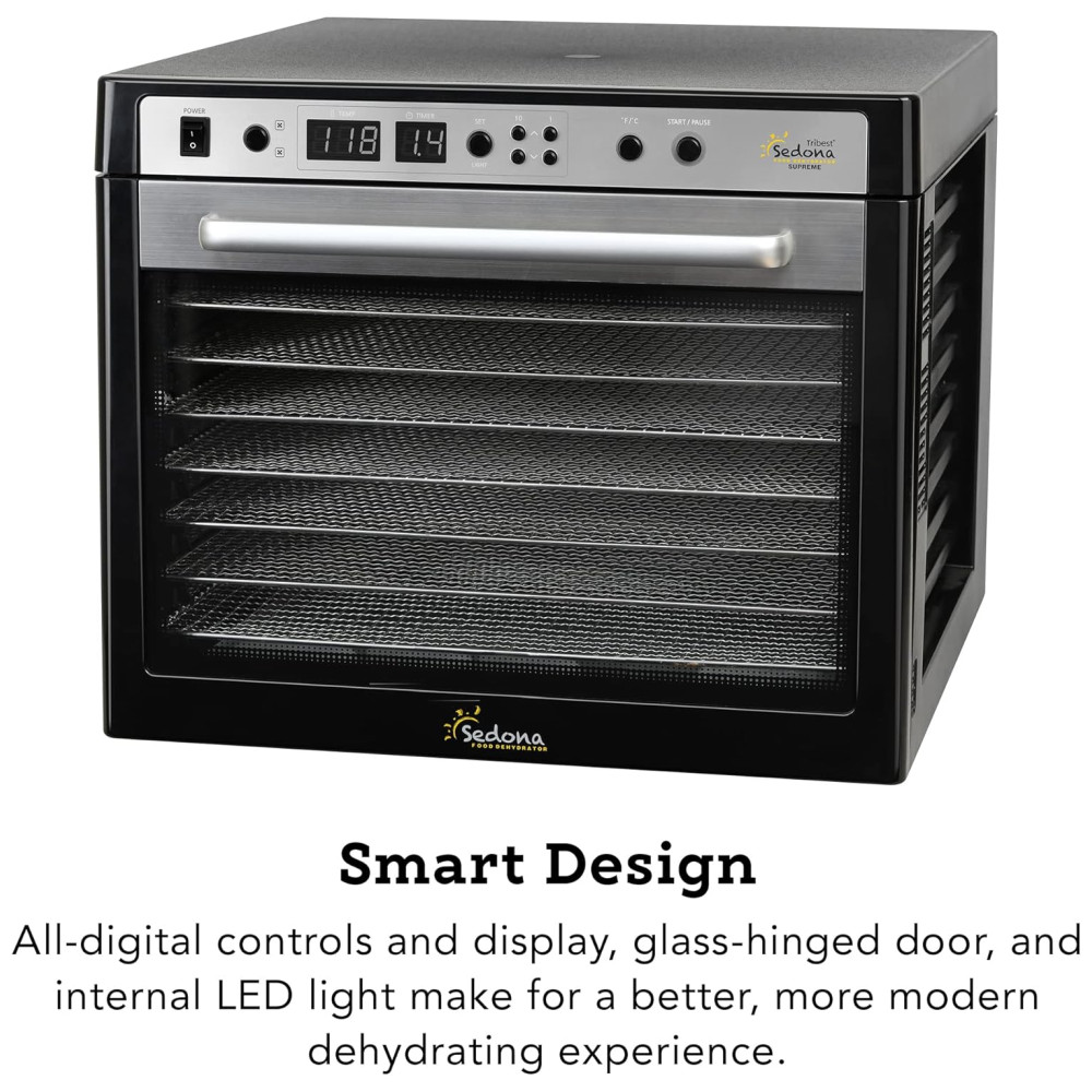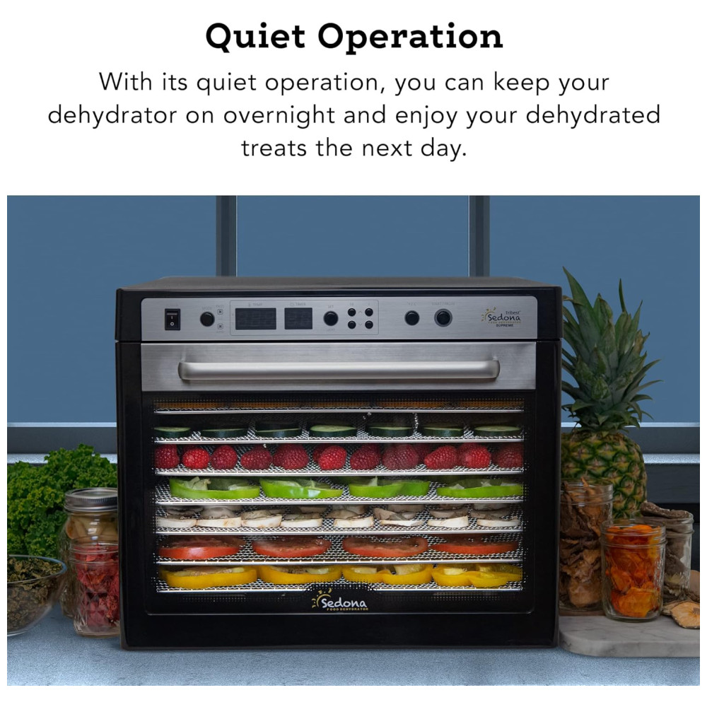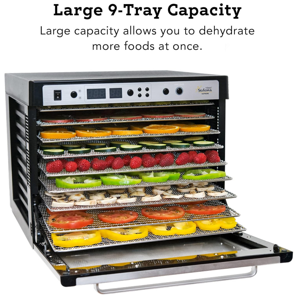 O Tribest Sedona Supreme é o primeiro desidratador digital de grande capacidade e cheio de recursos do mundo, com um filtro de ar reutilizável. Use todas as 9 bandejas com o avançado recurso TST de timer duplo para obter os melhores resultados para todas as suas necessidades de desidratação. De frutas e legumes a carnes e biscoitos, a tecnologia de ventilador central do Sedona Supreme garante fluxo de ar uniforme e desidratação rápida. O Sedona Supreme permite que você defina a temperatura e o timer usando seus controles totalmente digitais amigáveis. Desidratação de precisão nunca foi tão fácil.