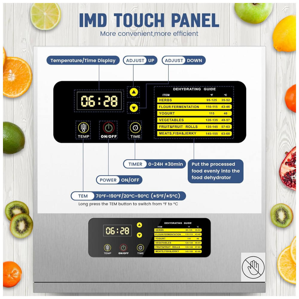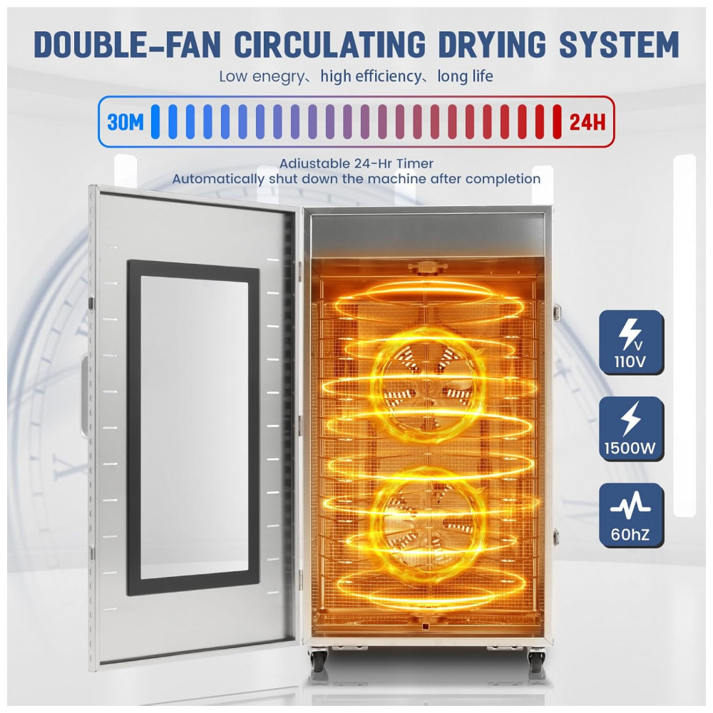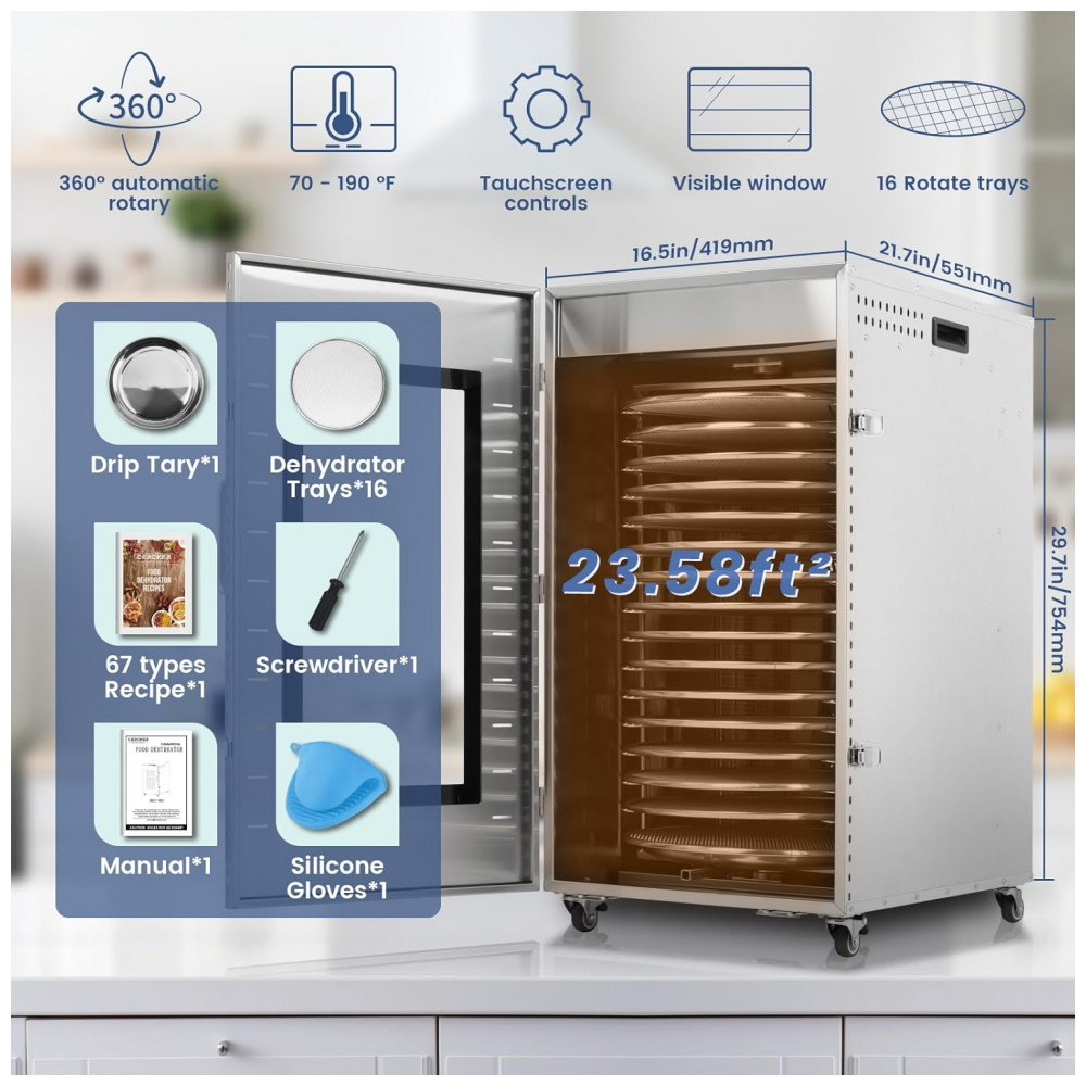 A bandeja do desidratador é feita de material de aço inoxidável 304, permitindo o contato direto com ingredientes alimentares. Com capacidade de 5,62 metros e 16 bandejas, é ideal para desidratação de carne seca, carne bovina, frutas, carne, ervas, etc. O design de frequência variável de motor duplo economiza energia e possui alta eficiência e longa vida útil.
