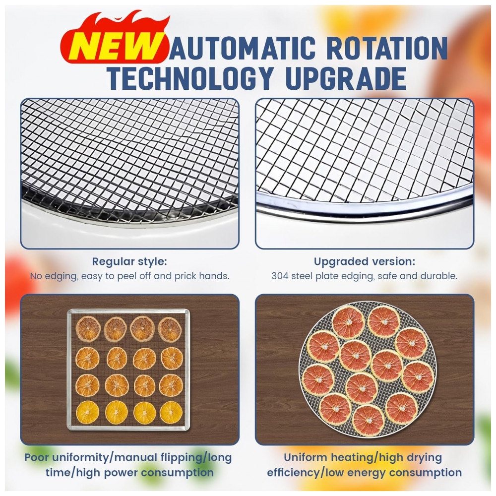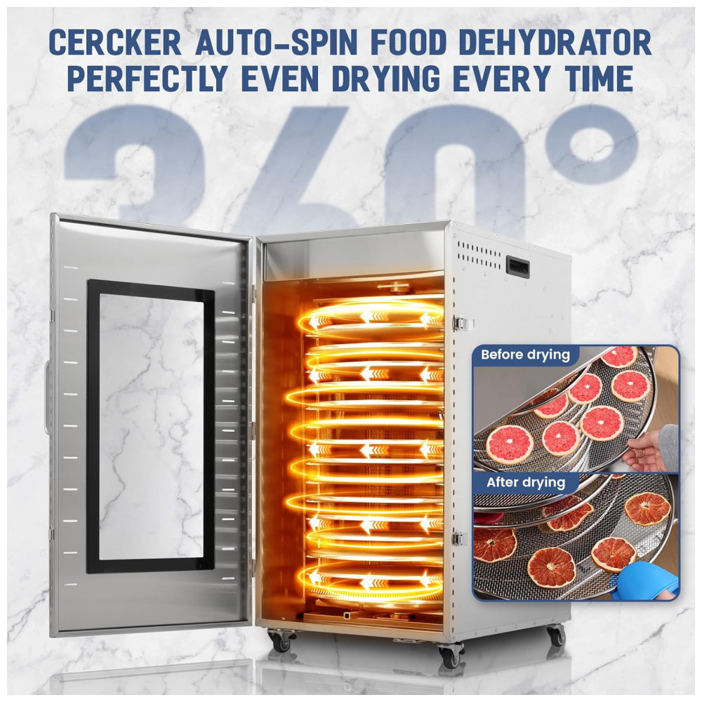 Este desidratador de alimentos comercial possui uma tecnologia exclusiva de rotação automática 360, que melhora a eficiência de secagem. A rotação uniforme em todas as direções evita secagem parcial e torna a produção mais livre de preocupações. O corpo do chassi integrado é feito de aço inoxidável 100 de qualidade alimentar, com prevenção de ferrugem, resistência ao desgaste e resistência ao fogo.