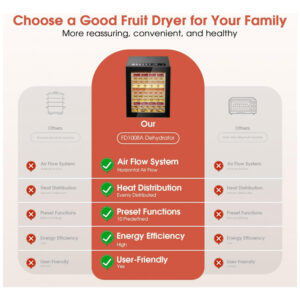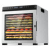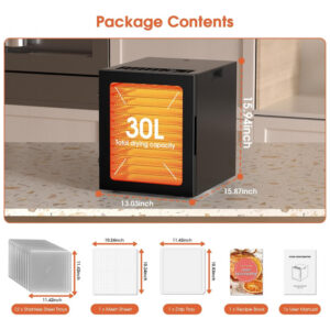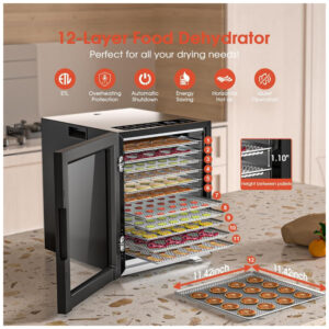 Desidratador de alimentos de grande capacidade com 12 bandejas para desidratar grandes lotes facilmente. As bandejas grandes de 29 x 29 cm são perfeitas para preparar lanches para toda a família ou preservar colheitas do jardim. Com 10 configurações inteligentes para desidratar alimentos facilmente, obtendo resultados perfeitos com um toque. Ajuste facilmente o tempo de 1 a 48 horas e a temperatura de 35 a 74°C para criar fatias de frutas macias ou jerky mastigável ao seu gosto. Equipado com luz interna e porta de vidro para monitorar os alimentos sem abrir a porta. Desliga automaticamente quando concluído, garantindo segurança durante o uso noturno. Inclui bandejas laváveis na lava-louças para facilitar a limpeza. Kit inicial completo com 12 bandejas, tela de malha, bandeja de gotejamento, manual e livro de receitas.