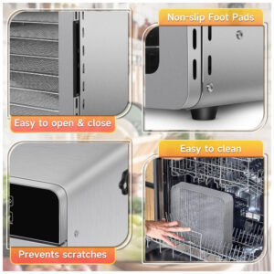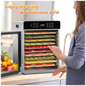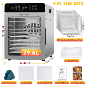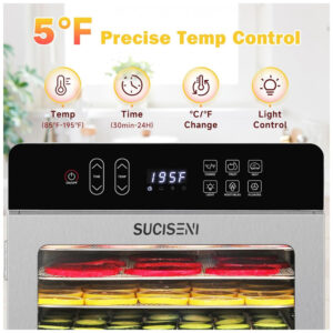 O Desidratador de Alimentos com 10 bandejas da SUCISENI possui dimensões do produto de 43,2 x 31,5 x 43,9 centímetros, com bandejas removíveis de 29 x 29 centímetros e uma área total de secagem superior a 2,7 metros quadrados. Com potência de 1000W, tubos de aquecimento espessados e um grande ventilador de 17,8 cm distribuem o calor uniformemente, reduzindo efetivamente o tempo de desidratação. Controle preciso de temperatura de 29 a 90,5°C, com ajuste de temperatura de 2,8°C, intervalo de tempo de 30 minutos a 24 horas e 4 modos pré-definidos para uma operação mais conveniente. Operação silenciosa com níveis de ruído abaixo de 50 dB, equipado com sistema de iluminação interna para visibilidade clara mesmo em condições de pouca luz. Porta de vidro à prova de explosão para monitoramento contínuo, evitando aberturas frequentes; pés antiderrapantes e bordas arredondadas para uso seguro.