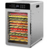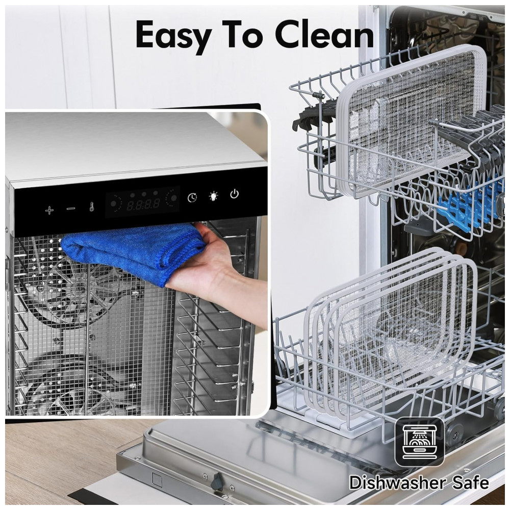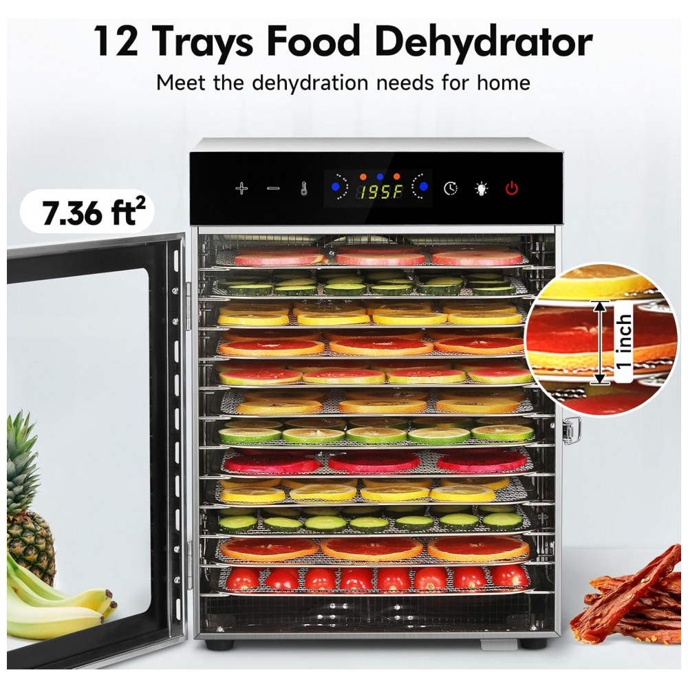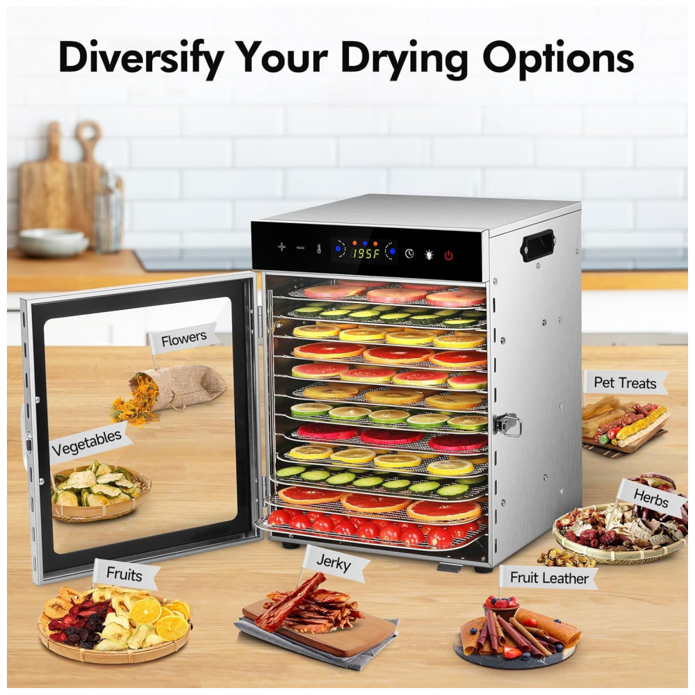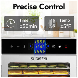 O Desidratador de Alimentos SUCISENI possui um sistema de aquecimento de alto desempenho de 1000W que aquece rapidamente, juntamente com dois ventiladores superiores e inferiores que criam um sistema de circulação de calor tridimensional para garantir que os alimentos sejam aquecidos de forma uniforme, mantendo uma textura consistente. Com 12 bandejas removíveis de 28,6 cm e espaçamento de 2,5 cm entre cada uma, oferece mais de 2,16 m² de espaço para secagem, sendo ideal para grandes quantidades de frutas, carne ou ervas. O controle preciso de temperatura varia de 29 a 90°C, ajustável em incrementos de 2,8°C, permitindo adequar a temperatura conforme a necessidade dos alimentos. O painel digital sensível ao toque permite ajustar o timer de 30 minutos a 24 horas, enquanto o painel LED exibe o progresso em tempo real, tornando a operação intuitiva e sem preocupações. Com porta de vidro à prova de explosão que proporciona uma visualização constante dos alimentos, não é necessário abrir e fechar com frequência, o que pode afetar a desidratação. A luz interna permite uma visão clara do interior, mesmo em ambientes com pouca luminosidade. Operando com menos de 45 dB, este desidratador de aço inoxidável garante uma experiência culinária silenciosa. Com medidas de 29,2 x 31 x 41 cm, é ideal para fazer frutas secas, vegetais, carnes, ervas, petiscos para animais e até fermentar massa, fazer iogurte e muito mais.