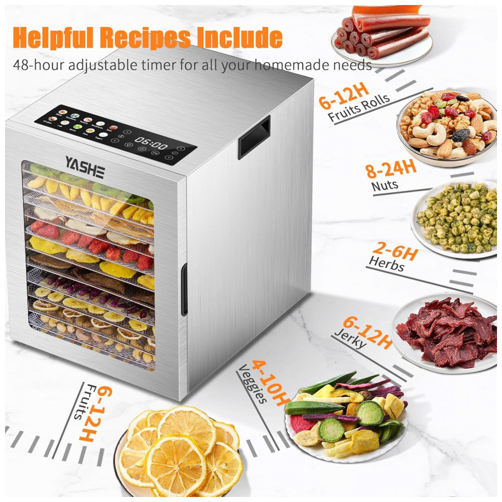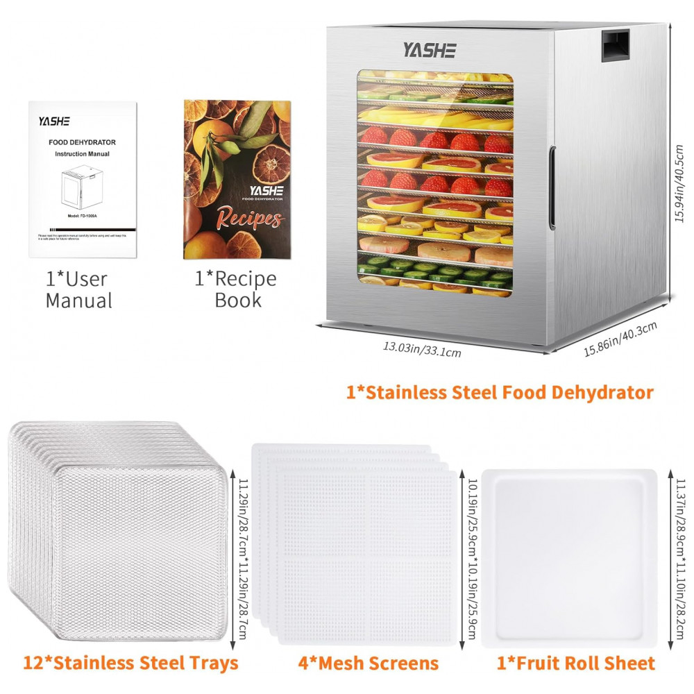 Desidratador de Alimentos YASHE 12 Bandejas de Aço Inoxidável 10 Programas Temporizador de 48H e Controle de Temperatura 850W