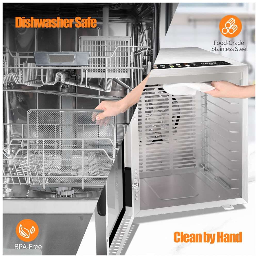 Desfrute da praticidade dos 10 programas pré-definidos deste desidratador de alimentos YASHE, ideais para Maçãs, Mirtilos, Tomates, Carne Bovina e muito mais. Ajuste facilmente o tempo de até 48 horas e a temperatura de 35°C a 74°C através do painel de controle LED para desidratação personalizada. Com capacidade de 12 bandejas ajustáveis em aço inoxidável, é ideal para secar frutas, vegetais, carnes e ervas em grandes quantidades. Seu motor potente de 850W e fluxo de ar de 360 graus garantem distribuição de calor uniforme, sem a necessidade de girar as bandejas. O design em aço inoxidável durável facilita a limpeza, e as bandejas livres de BPA podem ir à lava-louças. Acompanha 12 bandejas, 4 telas de malha, uma folha para fazer rolinhos de frutas, livro de receitas e manual de instruções. Com recursos práticos como armazenamento de cabo, alças laterais e operação silenciosa, este desidratador é versátil e confiável para desidratar ervas, jerky e muito mais.