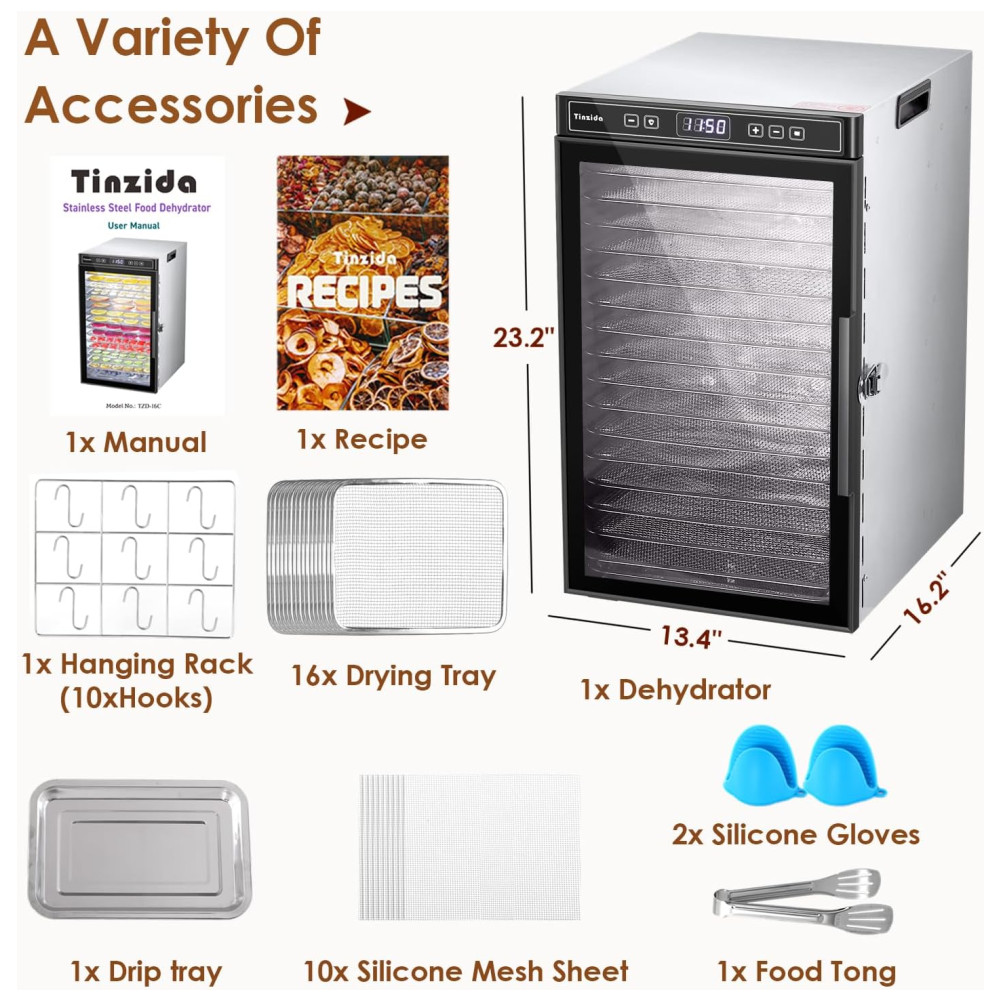 GRANDE CAPACIDADE DE 16 CAMADAS Com uma capacidade extragrande, a máquina desidratadora de alimentos inclui 16 bandejas de aço inoxidável de qualidade alimentar de 12,2110,2 polegadas e 10 folhas de malha de silicone