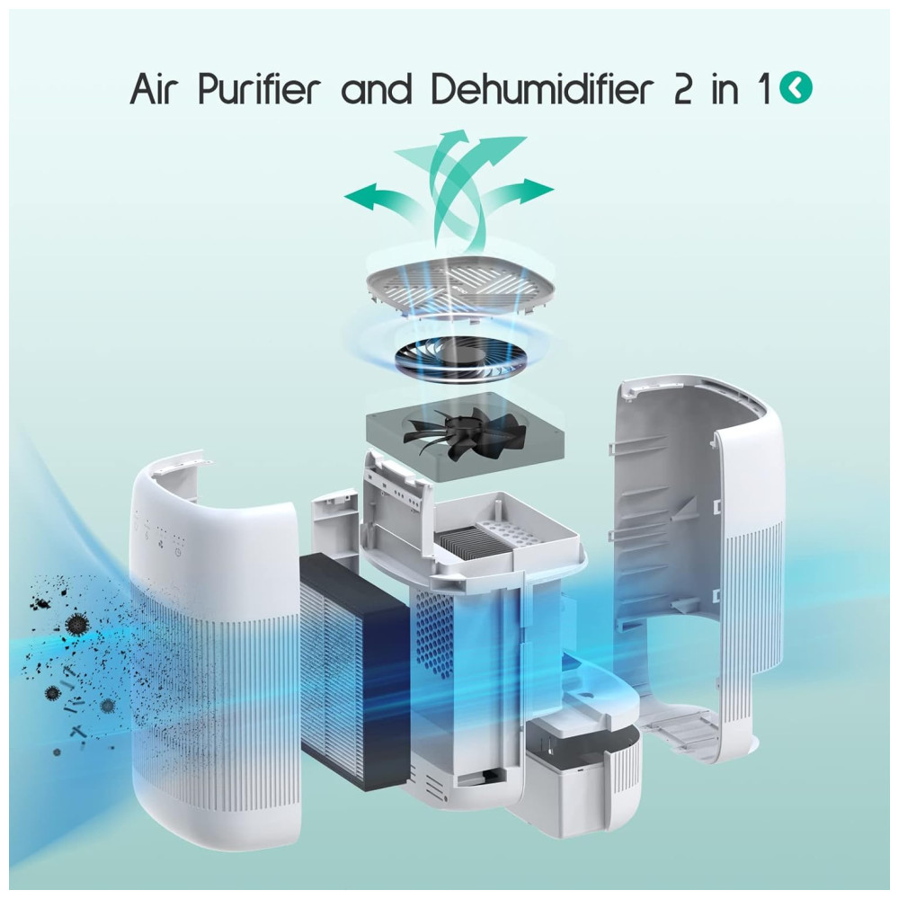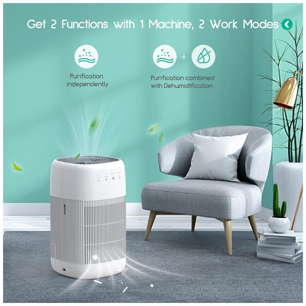 Purificador de ar e desumidificador 2 em 1 Afloia Q10 combina as funções de um desumidificador e purificador de ar. Estas 2 funcionalidades podem ser utilizadas separadamente ou combinadas. Não só tem dupla função com o mesmo preço de um purificador de ar ou desumidificador, mas também economiza espaço.