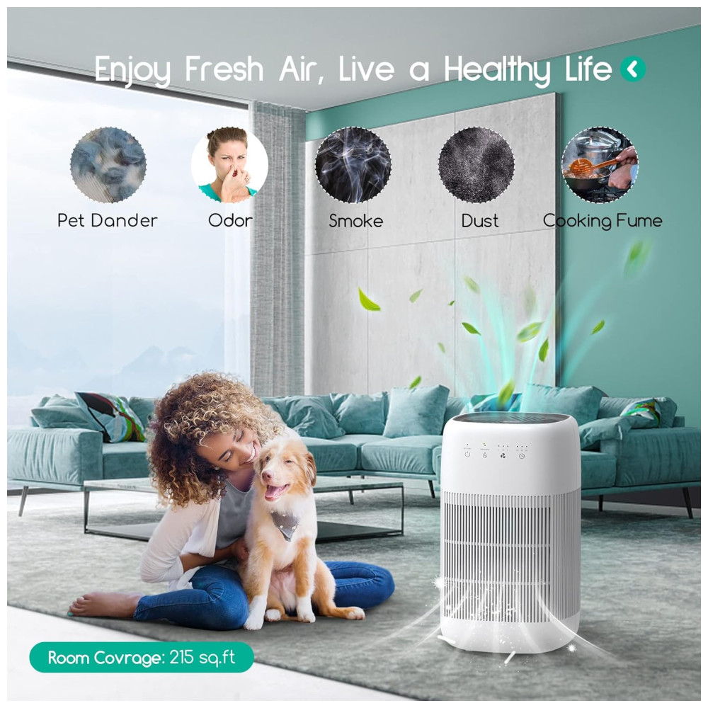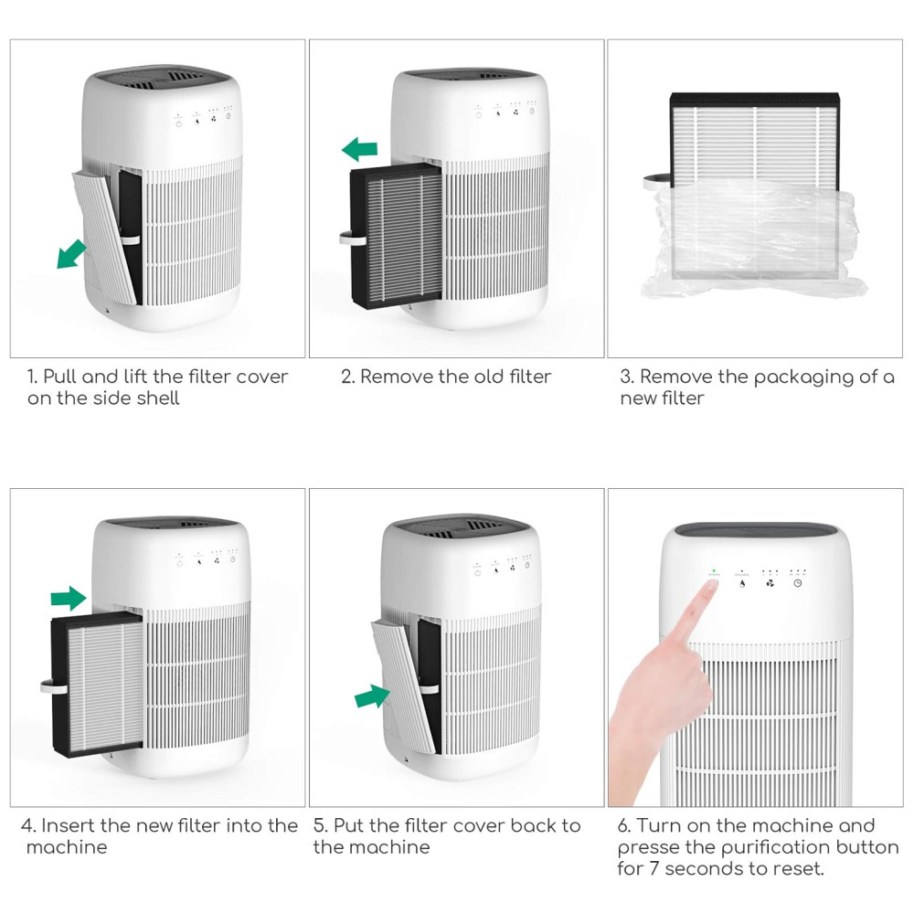 Filtro H13 HEPA O sistema de filtragem H13 HEPA pode reter 99,97 das partículas finas tão pequenas quanto 0,1 mícron e grandes poluentes, como poeira, pêlos de animais e fumaça. Quase nenhum poluente pode escapar do poderoso purificador, desfrute livremente do ar fresco em seu quarto.