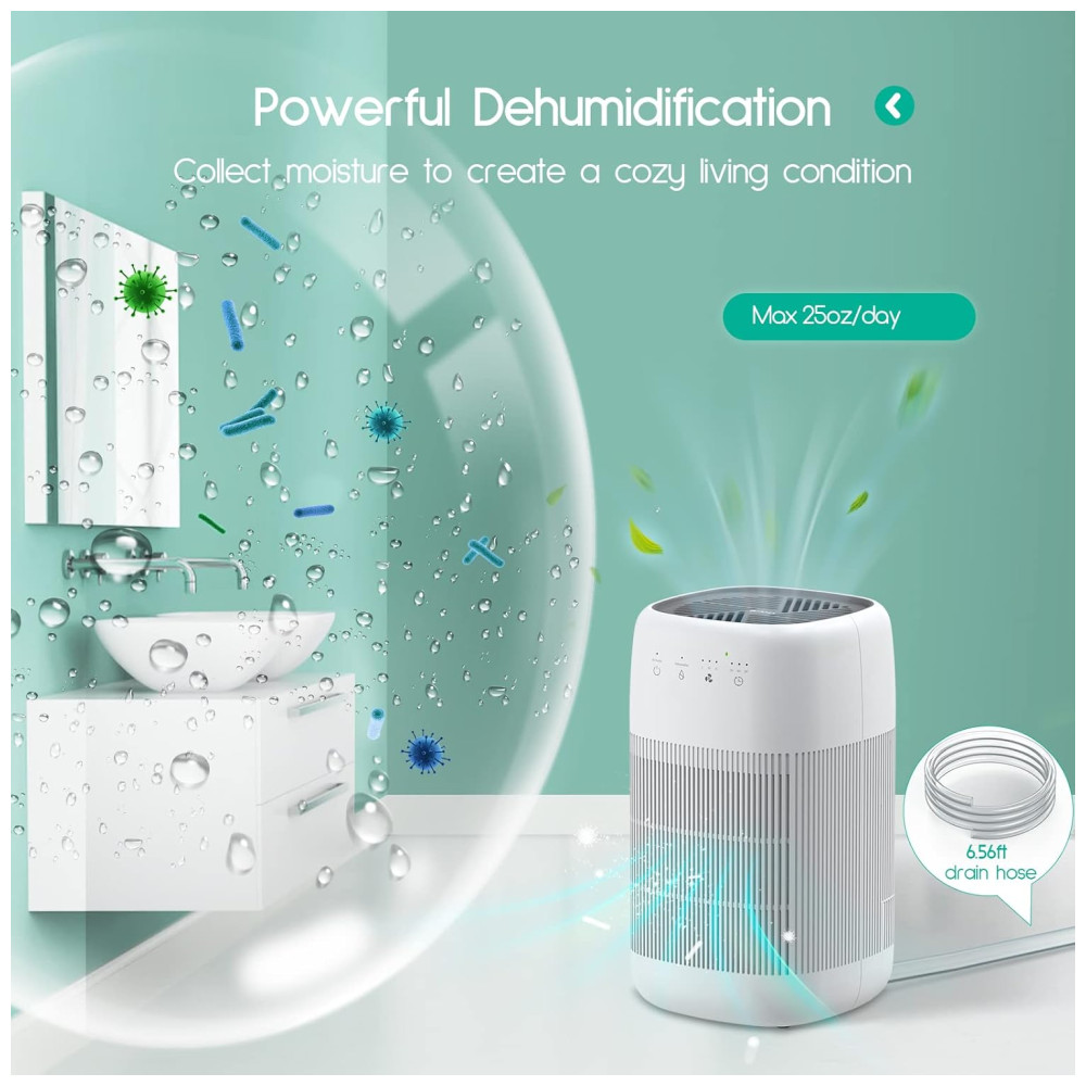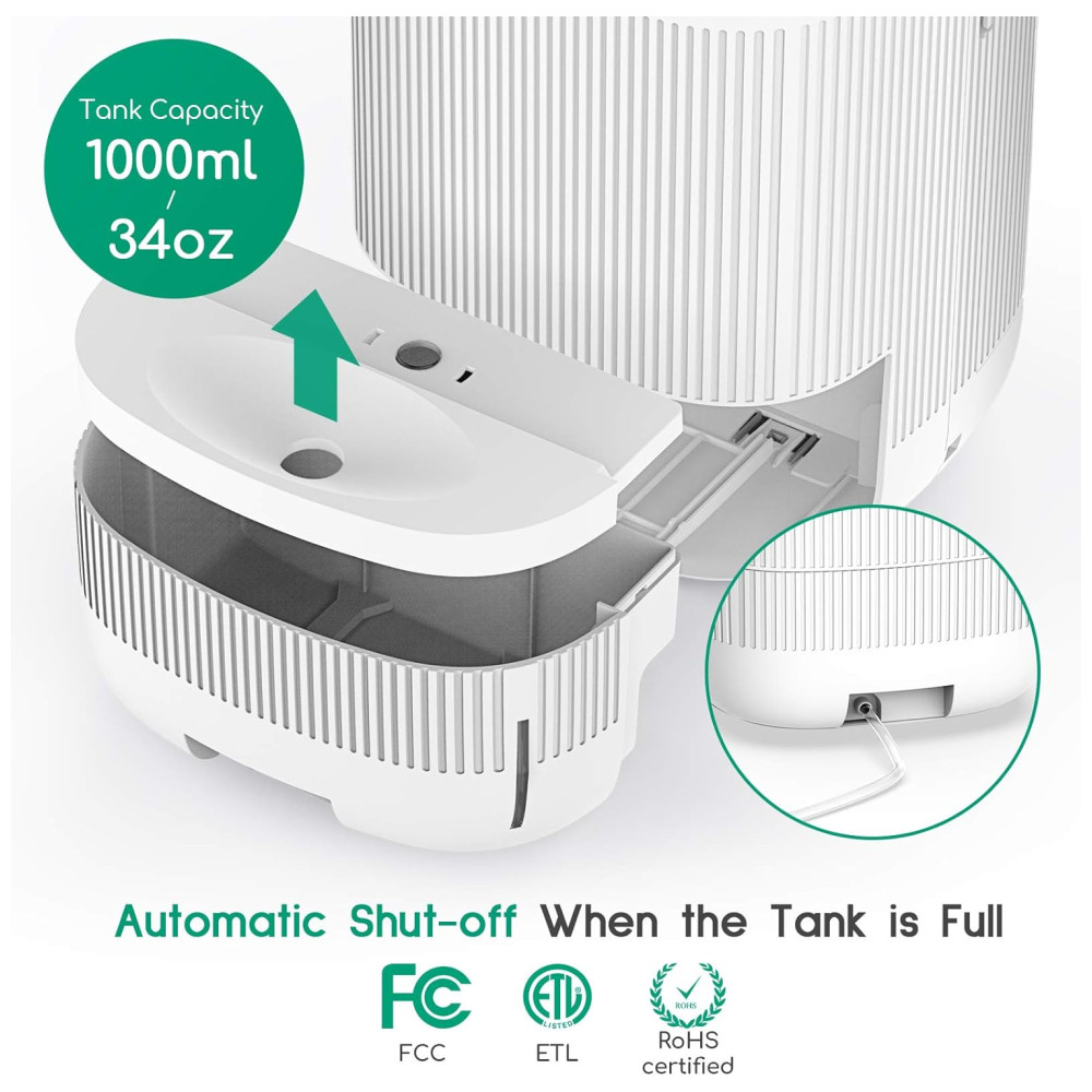 Design simples e inteligente Uma aparência arredondada com controles de toque, inicialização com um botão, desligamento automático, cronômetro de 3 estágios 2h , 4h , 8h, velocidades de ventilador de 3 estágios. Quando o tanque de água estiver cheio, o indicador piscará em vermelho como um lembrete Quando o filtro precisar ser substituído, o indicador piscará em laranja. Capacidade do tanque 1000ml , 34oz, colete até 750ml de água por dia 86 F, 80 UR, área de cobertura do desumidificador 215 pés quadrados , 20