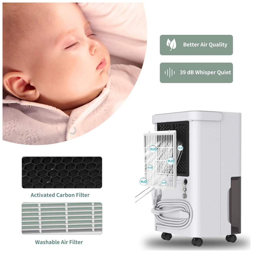 Design Humanizado Múltiplo O desumidificador de segurança possui 2 modos de desumidificação Lavanderia modo contínuo, Automático modo personalizado Rodas e alça universais embutidas, fáceis de mover Reinício automático e descongelamento automático O filtro de carvão ativado substituível torna o ar da sua casa mais limpo e fresco
