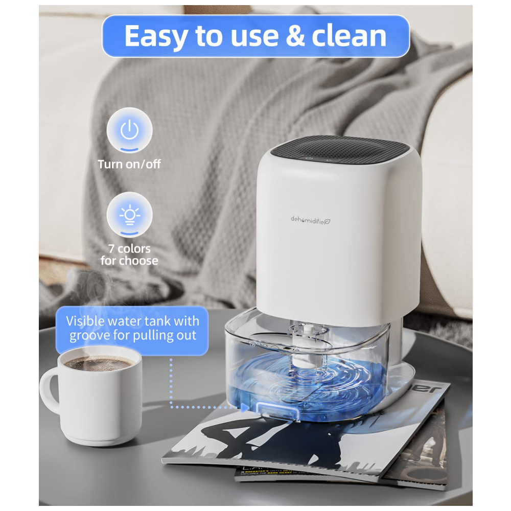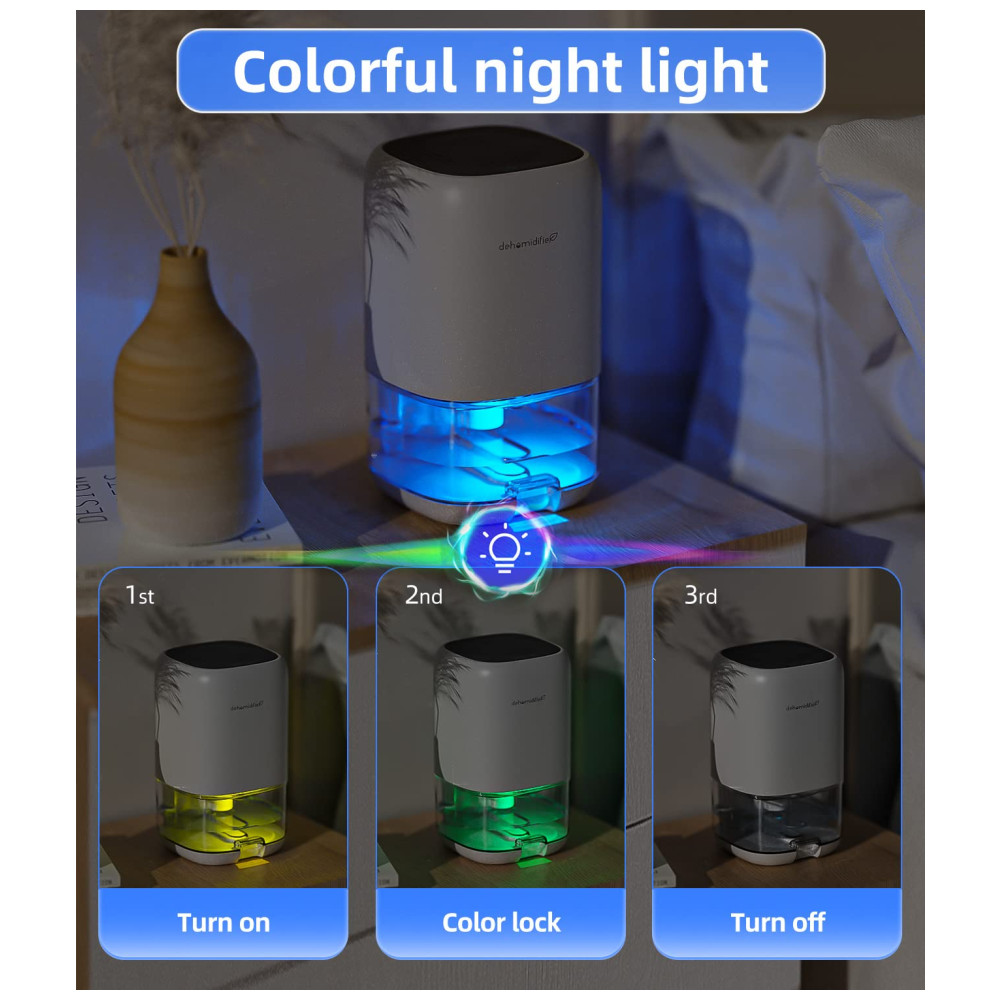 Pequenos desumidificadores com luz colorida: há um botão de luz separado, que pode emitir luzes de atmosfera romântica de 7 cores para você, e a operação ultrassilenciosa 28dB cria um ambiente confortável e tranquilo para seu quarto e escritório.