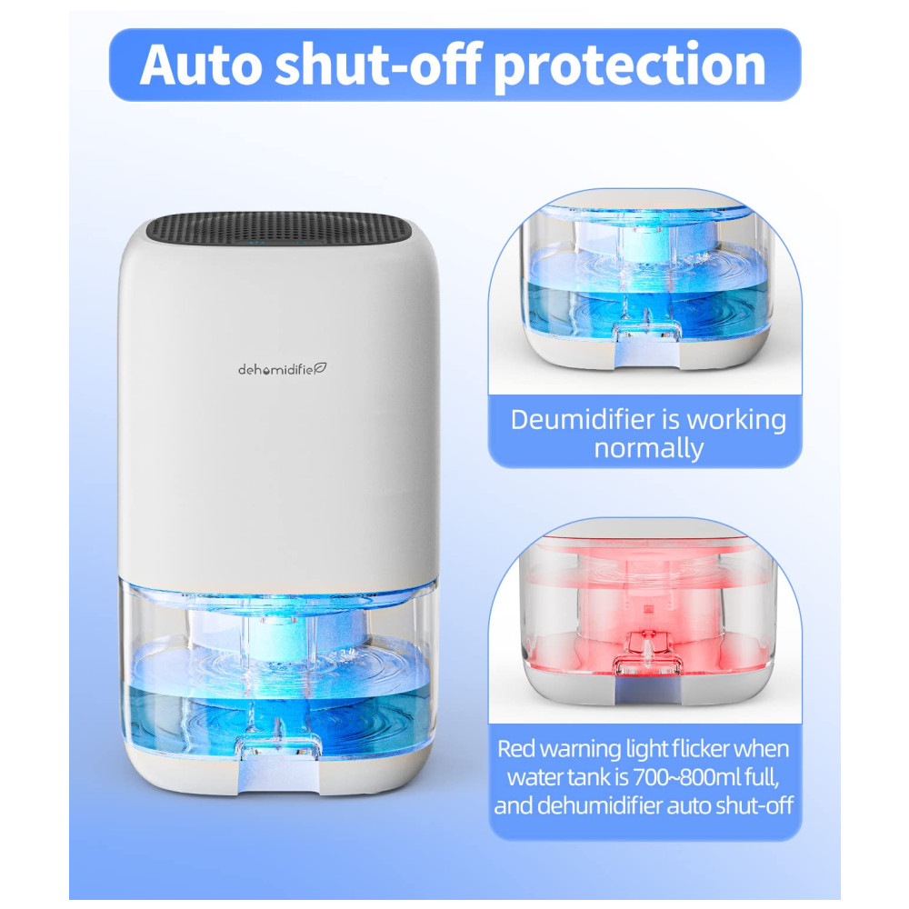 Proteção de desligamento automático: Quando o tanque de água estiver cheio de 700 800 ml, os desumidificadores desligarão automaticamente o trabalho e a luz piscará em vermelho para informá lo. Também é muito e conveniente de usar quando você não está em casa.
