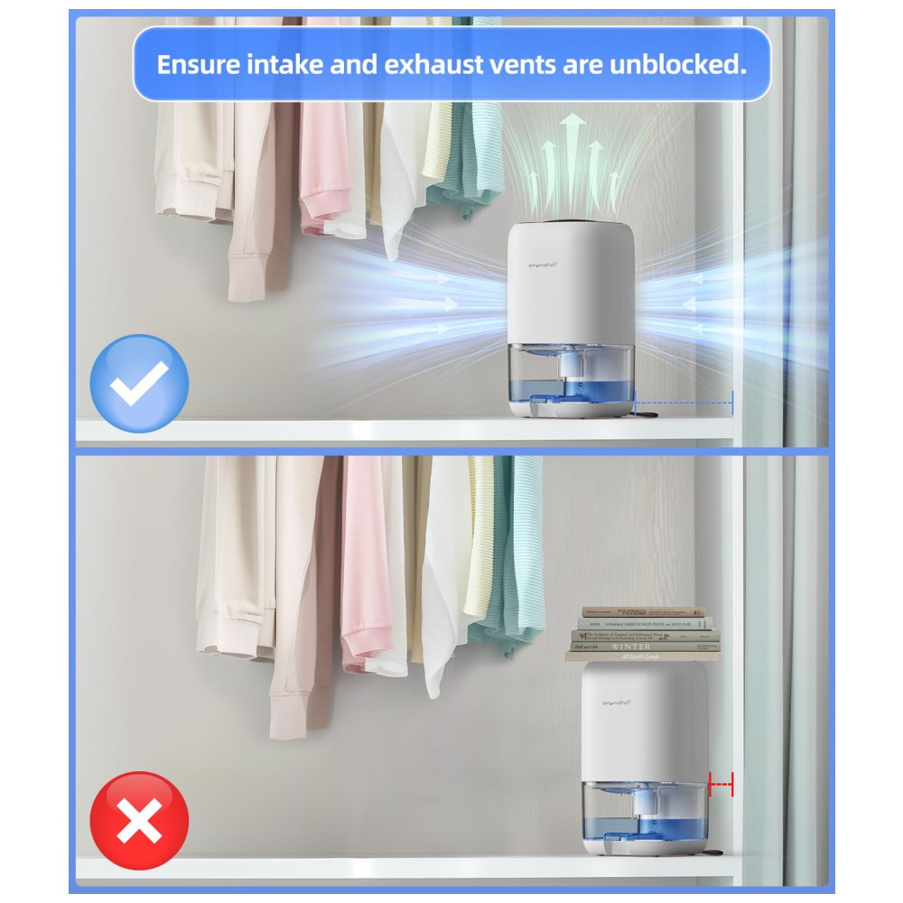 Dicas de uso importantes: Mantenha a entrada de ar superior e a saída traseira deste desumidificador livres de bloqueios