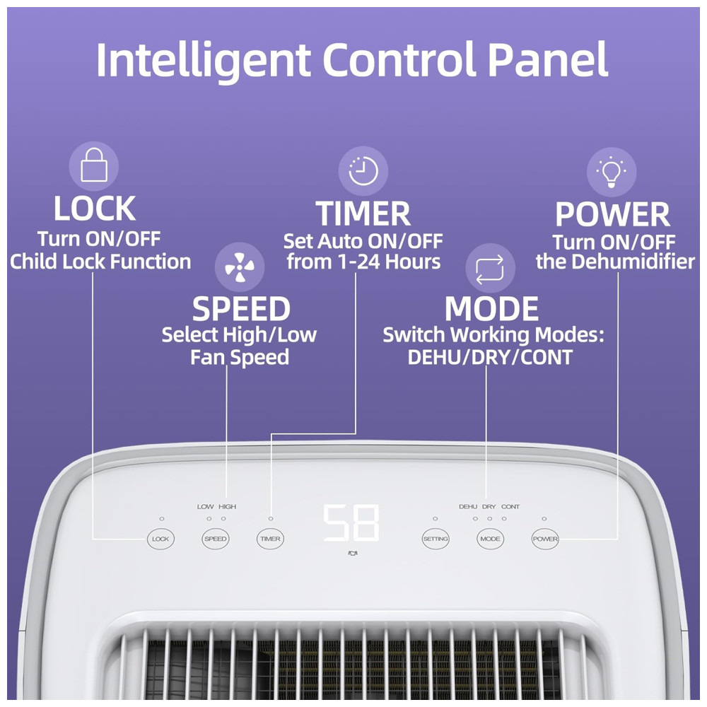 CONTROLE DE TOQUE INTELIGENTE EASY CLEAL Apresentando com um painel inteligente. Controle Automático de Umidade Basta ajustar a configuração de umidade ideal, ele detectará de forma inteligente a umidade do ambiente e controlará a desumidificação para manter os níveis de umidade predefinidos. Temporizador de 24 horas para operação predefinida e economia de energia, absorva umidade de maneira eficaz sem aumentar sua conta de energia. Desligar , ligar automaticamente desliga automaticamente quando o balde está cheio e liga o novamente após o balde ser esvaziado.