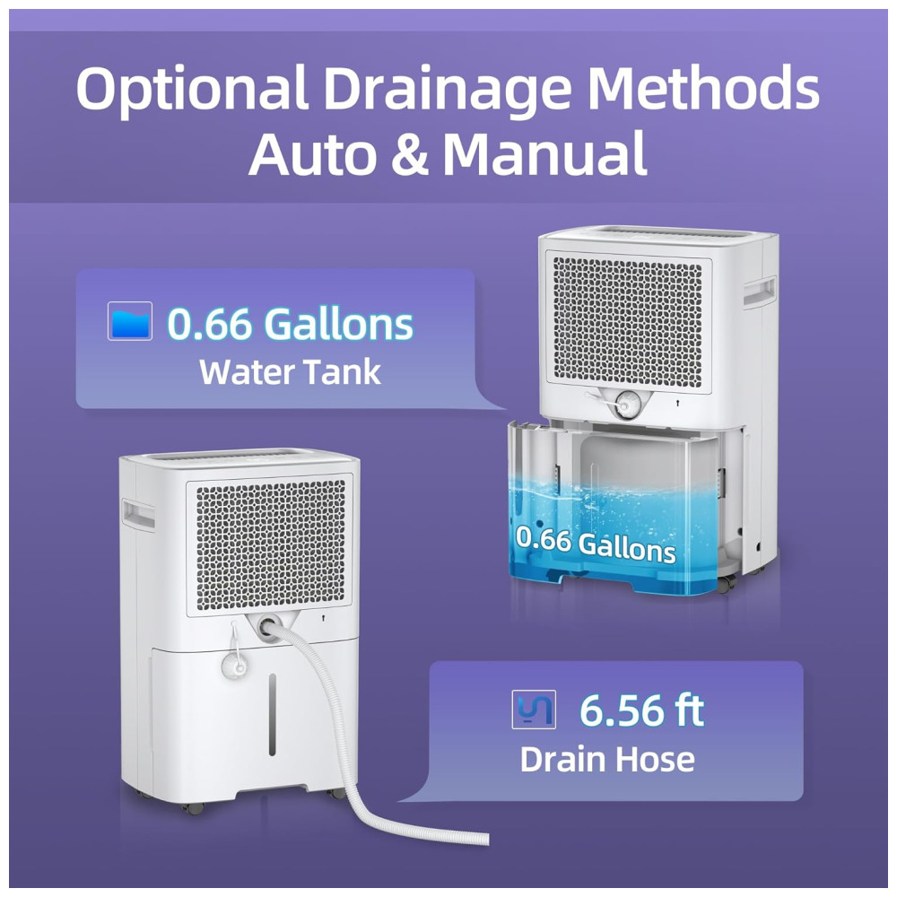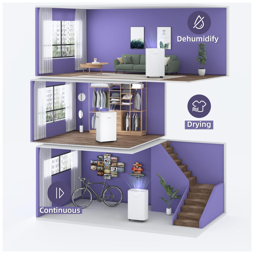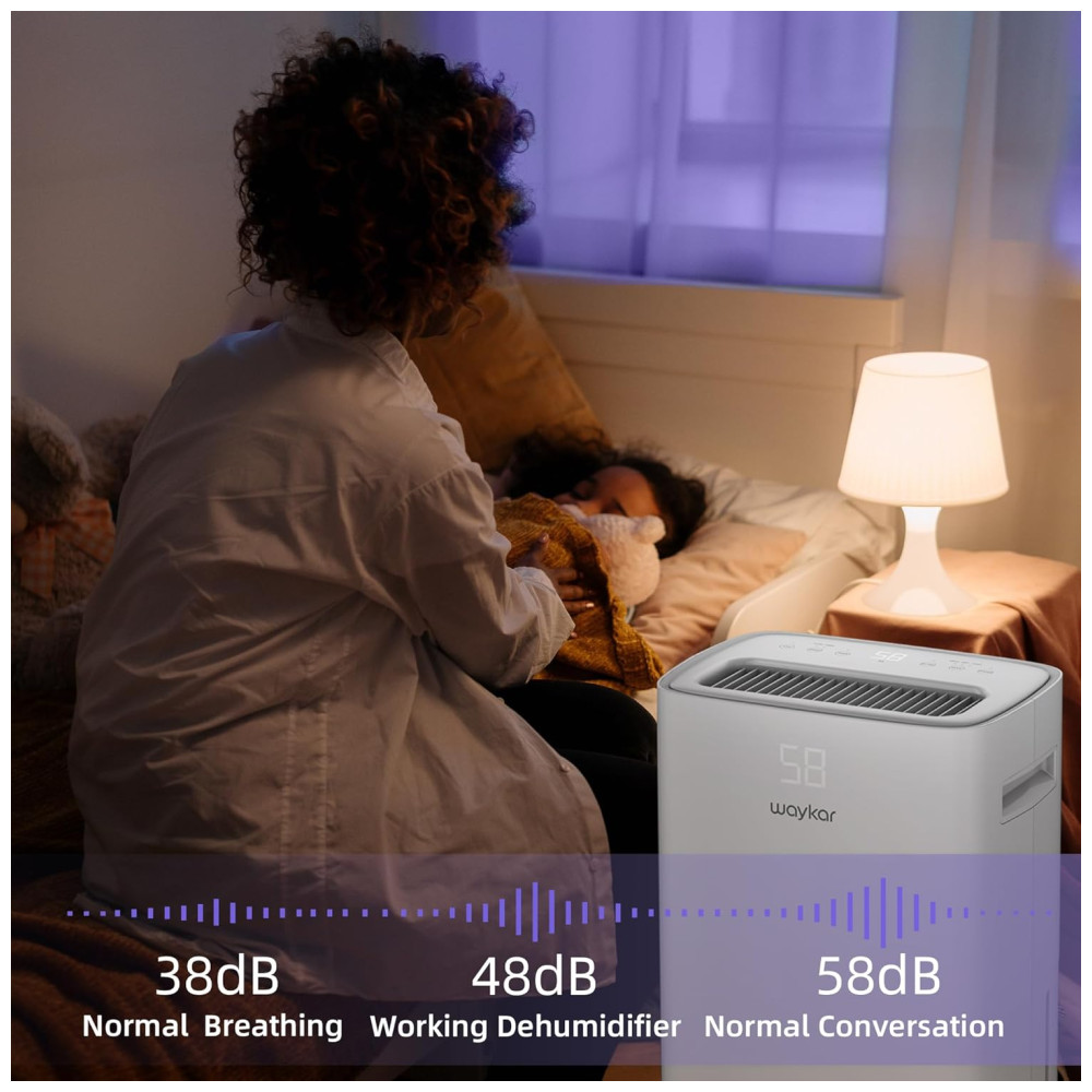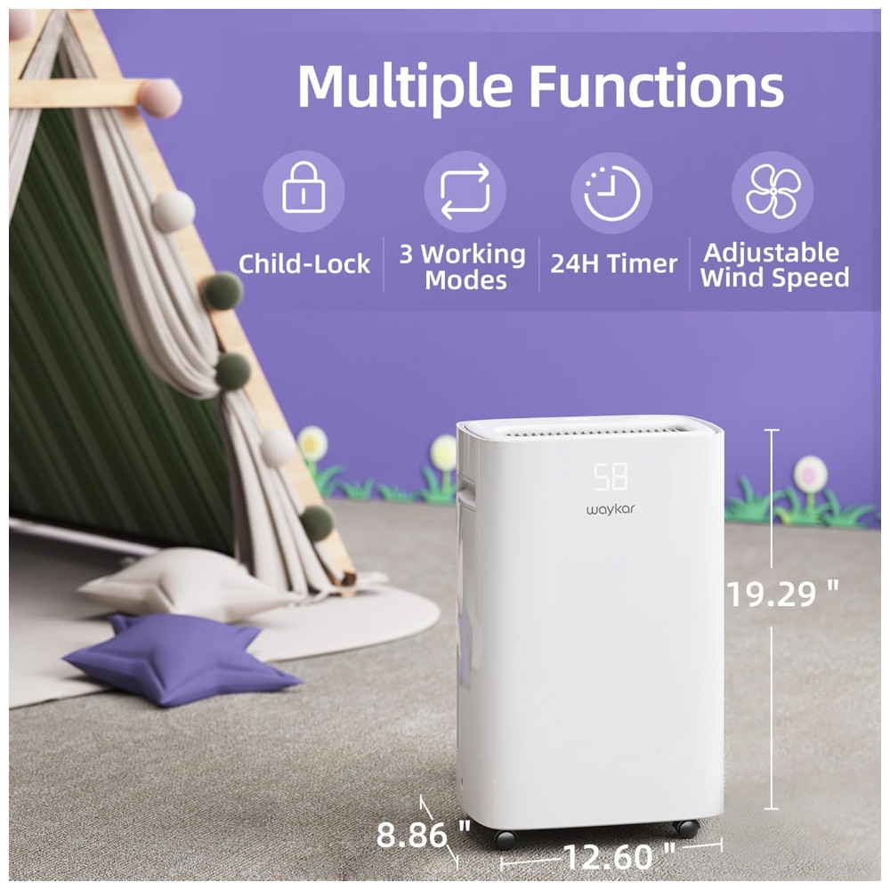 RECURSOS INOVADORES E PORTÁTEIS Projetado com uma aparência elegante como uma decoração moderna em sua casa, o desumidificador Waykar também é o assistente portátil da vida diária. Rodas giratórias e alça ergonomicamente posicionada incorporada permitem movê la para qualquer espaço com facilidade. Além disso, a saída de ar Upward continua secando o ar de forma rápida e eficaz, esta unidade funciona com velocidade de ventilador ajustável que não o perturbará enquanto dorme e trabalha .