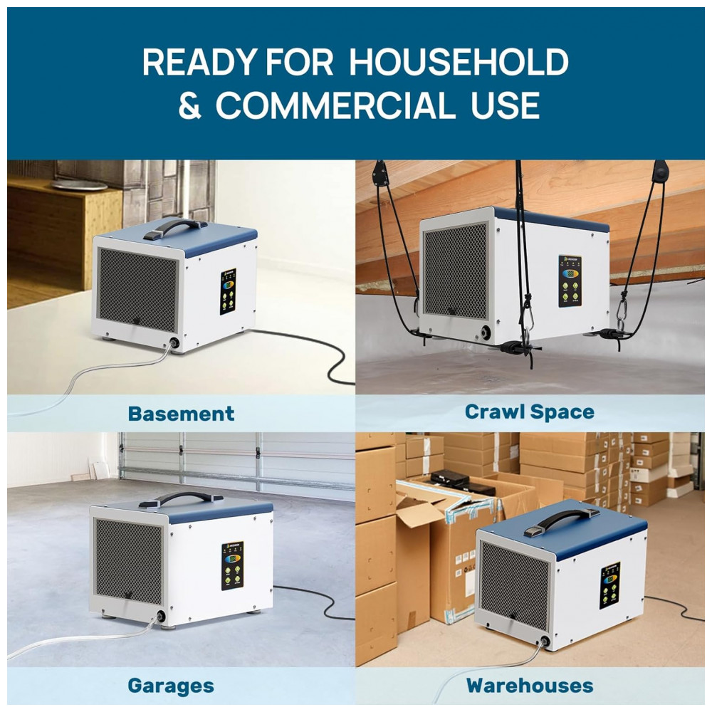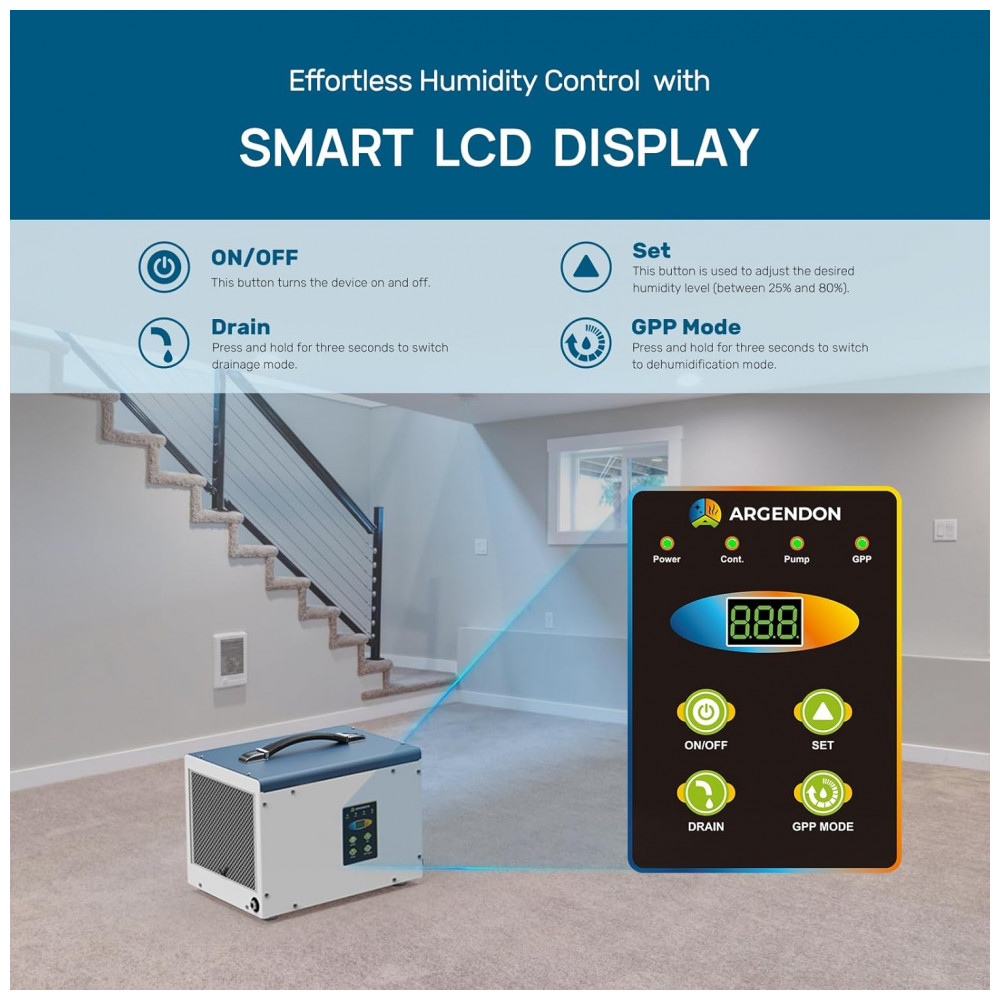 O Desumidificador Comercial de 33 litros da ARGENDON remove eficientemente até 33 litros de umidade por dia, com saída de ar de 115 CFM. Perfeito para áreas de até 92 m2, é ideal para porões, espaços de rastejo, banheiros, quartos grandes, closets, cozinhas e até mesmo espaços de escritório. Este desumidificador de porão com bomba oferece duas opções de drenagem: utilize a mangueira de drenagem de 0,60 m2 para drenagem por gravidade ou a bomba de condensado embutida para drenagem flexível, permitindo que a água seja direcionada até 1,82 m2 ou para fora da janela. Controle de umidade ajustável, sensor de umidade embutido, controle remoto conveniente e design compacto tornam este desumidificador portátil uma escolha eficaz e prática. A função de descongelamento automático reduz o acúmulo de gelo nos componentes internos em baixas temperaturas, garantindo operação confiável mesmo em condições frias.