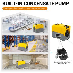 O conjunto utiliza compressor Panasonic e gabinete em plástico rotomoldado compacto, com dimensões reduzidas e formato empilhável para facilitar armazenamento e transporte. A bomba de condensado integrada e a mangueira de drenagem permitem escoamento contínuo da água coletada com elevação de até aproximadamente 4,6 m, reduzindo a necessidade de intervenção manual.