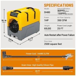 O desumidificador comercial MOUNTO DH80 foi projetado para aplicações de secagem e controle de umidade em áreas de até aproximadamente 232 m², utilizando tecnologia LGR para alto desempenho de remoção de água do ar ambiente. O equipamento atinge capacidade de até 150 pints por dia em condição de saturação e 80 pints/dia em condição AHAM, com vazão de ar de 350 CFM, adequado para restauração após danos por água, obras e ambientes de grande porte.