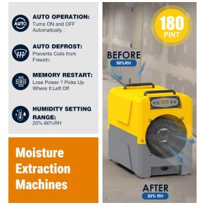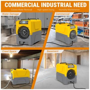 O painel com visor em LED permite ajuste de umidade-alvo, operação contínua e visualização de parâmetros de trabalho, com função de reinício automático em caso de queda de energia. O equipamento é indicado para uso profissional em restauração de umidade, porões, estufas e espaços industriais, mantendo operação contínua em faixas de temperatura especificadas pelo fabricante.
