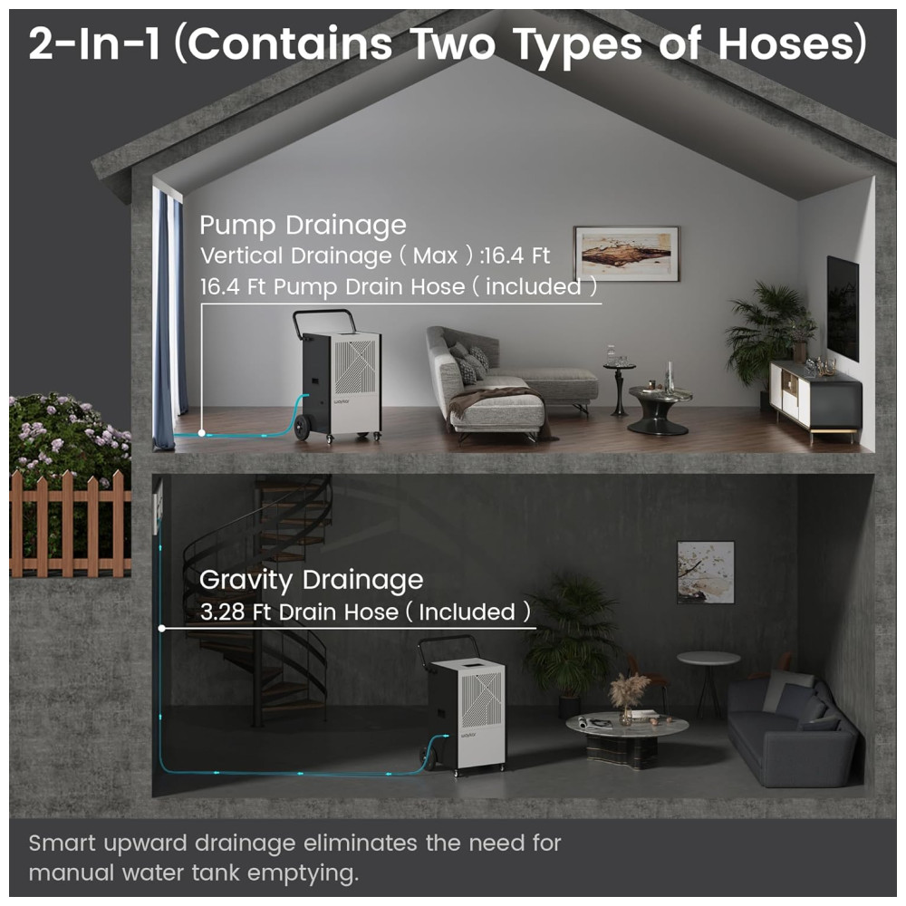 Componentes Inclusos: Mangueira de drenagem por gravidade de 1 metro, Manual do Usuário, Conector da mangueira de drenagem, desumidificador de 216 litros com bomba, Mangueira de drenagem da bomba de 5 metros,