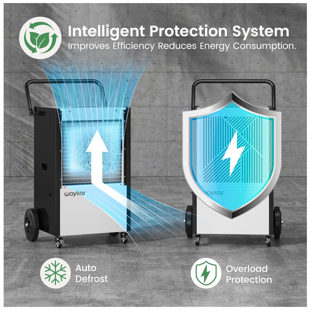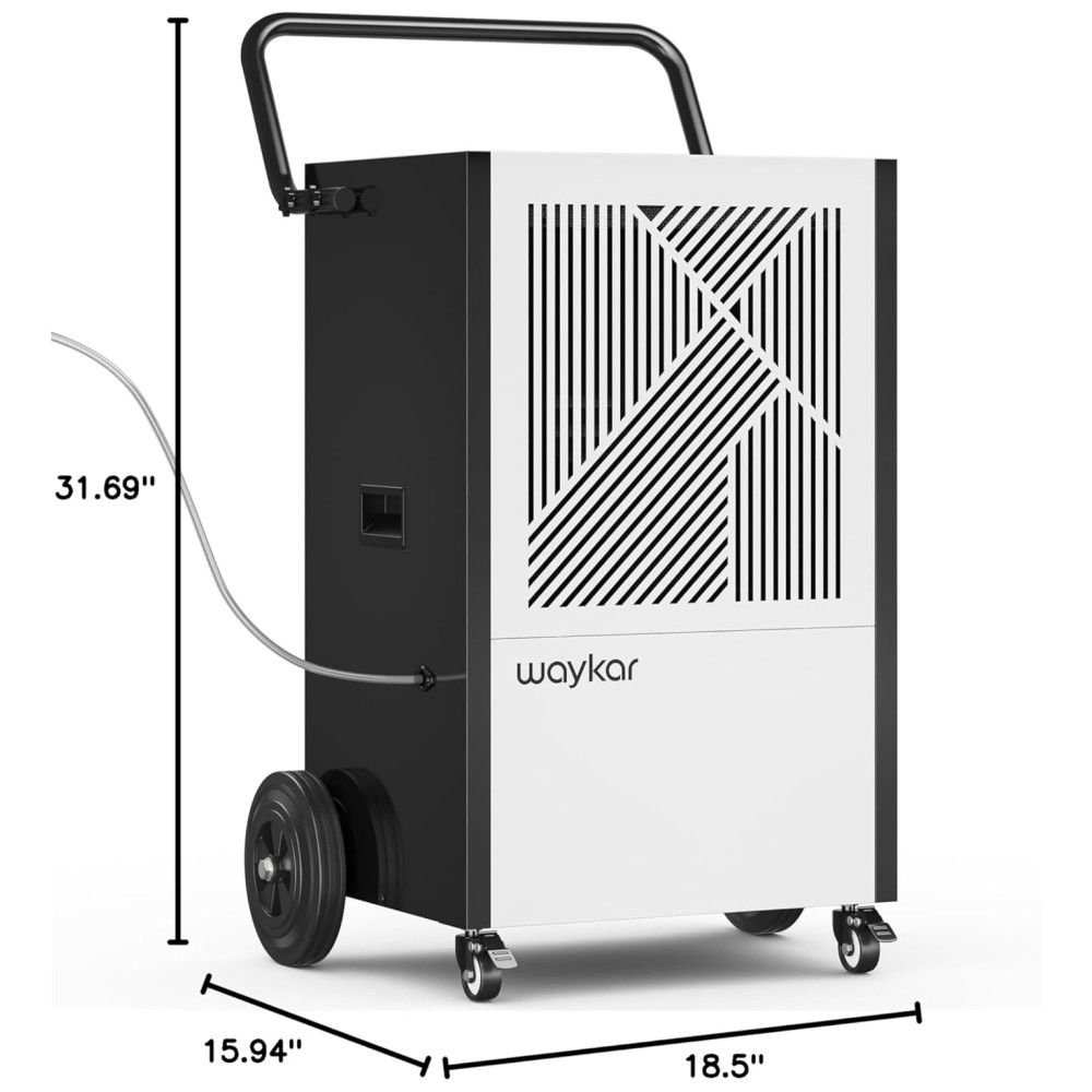 O Desumidificador Comercial Waykar 102,20 litros é eficiente e econômico, capaz de remover até 102,20 litros de umidade por dia em ambientes de até 809 metros quadrados. Com compressores de alta eficiência, é ideal para porões grandes, armazéns, academias, piscinas internas, saunas, salas de cultivo, fábricas e mais. Possui uma bomba automática e mangueira de drenagem por gravidade, oferecendo opções versáteis de descarte de condensado. Com um sistema de proteção integrado, é seguro e confiável, com função de memória e descongelamento automático. Fácil de mover e operar, conta com interface amigável, bomba embutida e rodas grandes. Seu alto fluxo de ar de 371 CFM garante uma secagem superior de vários materiais e superfícies, sendo ideal para restauração após danos por água, limpeza de inundações e secagem de construções.
