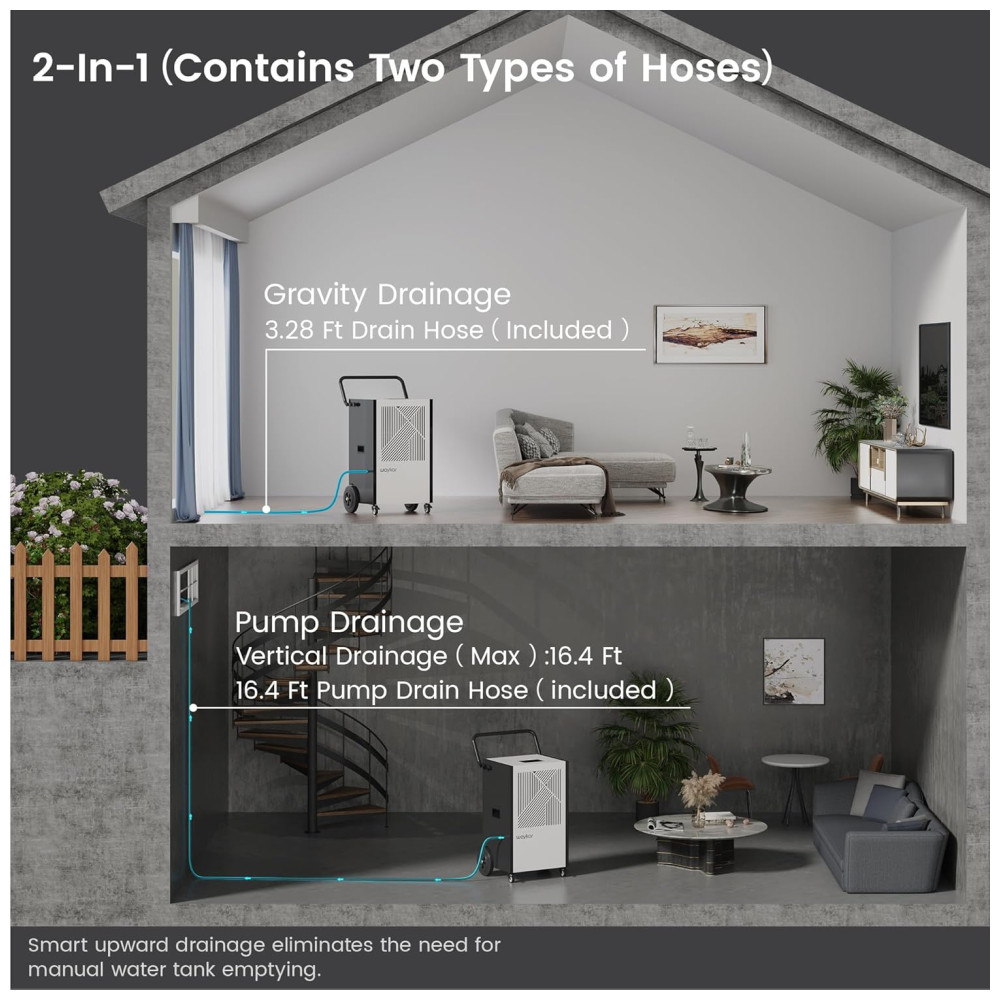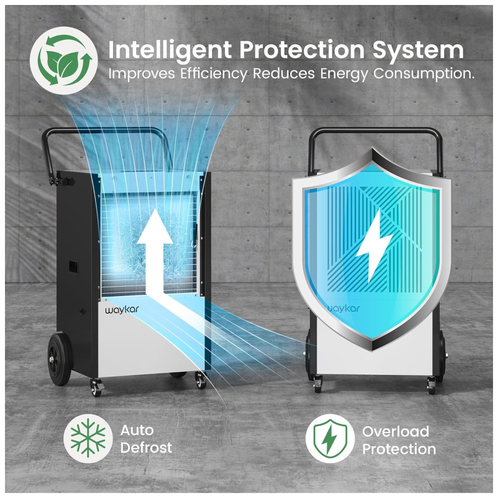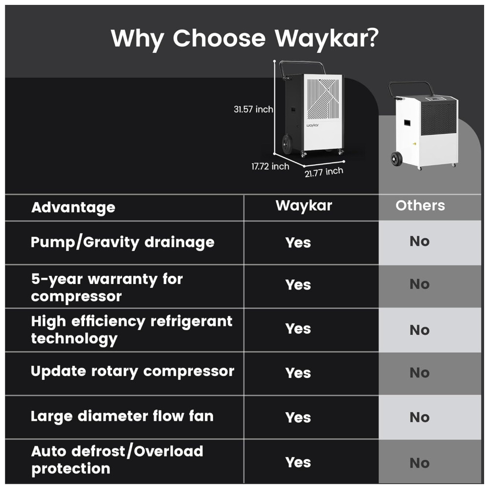 O Desumidificador Comercial Waykar 151,41 litros com Bomba é eficiente e economiza energia, capaz de remover até 151,41 litros de umidade por dia em espaços de até 883 metros quadrados. Com compressores de alta eficiência, é ideal para porões amplos, armazéns, academias, piscinas internas, áreas de spa, salas de cultivo, fábricas e mais. Possui uma bomba automática para descarte fácil de condensado, além de mangueira de drenagem por gravidade. Com sistema de proteção integrado, é fácil de mover e operar, com alta capacidade de fluxo de ar para secagem superior de diversos materiais e superfícies.
