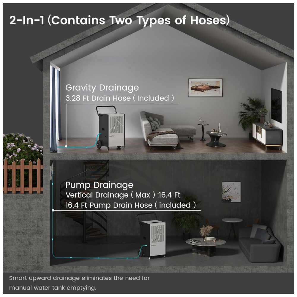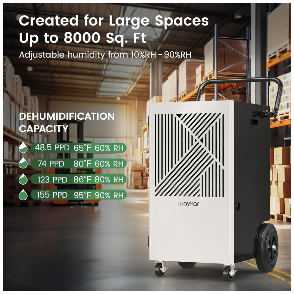 O Desumidificador Comercial Waykar de Grande Porte com Bomba é capaz de remover até 73,34 litros de umidade por dia em espaços de até 761 metros quadrados. Com compressores de alta eficiência, é econômico e ideal para porões amplos, armazéns, academias, piscinas internas, áreas de spa, salas de cultivo, fábricas, e muito mais. Possui bomba automática para fácil descarte do condensado, drenando a água por até 5 metros em qualquer direção. Além disso, conta com mangueira de drenagem por gravidade. Com sistema de proteção integrado, protege contra sobrecargas e possui função de memória para restaurar configurações após queda de energia. Design compacto e fácil de mover, com rodas grandes, alça removível e trava nas rodas. Filtro lavável e reutilizável, economizando dinheiro em substituições e mantendo o ar limpo.