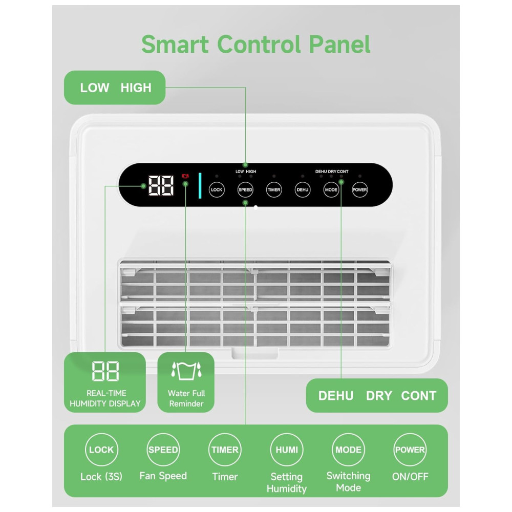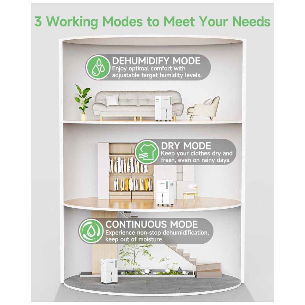Perfeito para grandes áreas como porões, escritórios e salas de estar, quartos, banheiros, porões, cozinhas, trailers, ajuda a manter uma faixa confortável de umidade de 3050, promovendo um espaço doméstico mais saudável 3 modos versáteis de desumidificação Eleve seu conforto interno com nossos desumidificadores de quarto 3 modos dinâmicos! O modo DEHU ajusta facilmente a umidade de 30 a 80 para criar o espaço ideal, o modo DRY é perfeito para secar rapidamente roupas delicadas, o modo CONT combate efetivamente a umidade