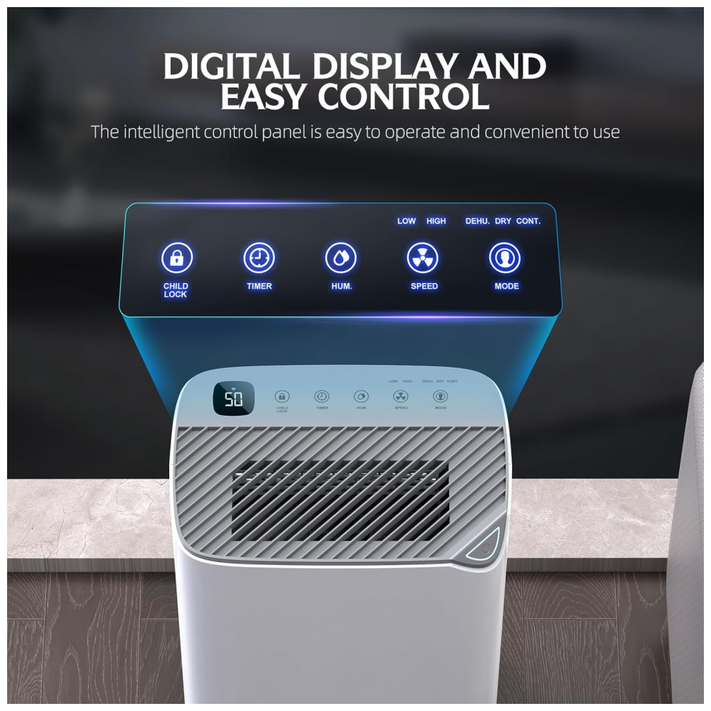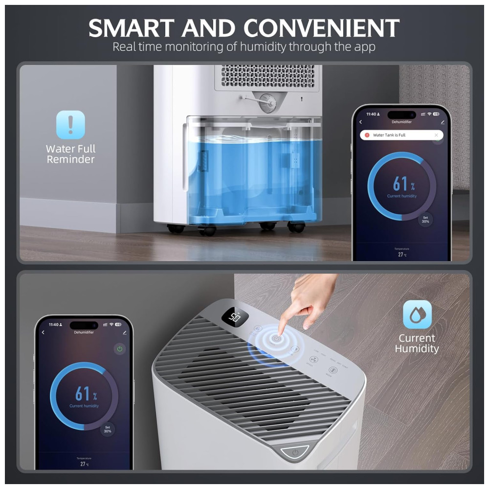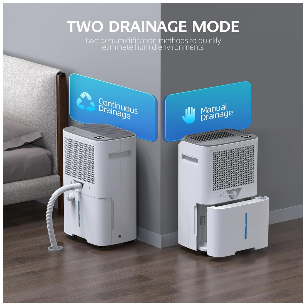 Este poderoso desumidificador para casa é capaz de remover 23,66 litros por dia a 35°C, 90% de umidade relativa, ajustando a umidade de 30 a 80, aumentando ou diminuindo em incrementos de 5, para que você possa ajustar ao nível desejado. Perfeito para uso no porão, banheiro, quarto ou garagens. Reconhecido como um modelo eficiente da Estrela de Energia, oferece alta eficiência energética combinada com as últimas inovações tecnológicas. Este desumidificador se destaca pela eficiência energética e sustentabilidade ambiental. Com 3 modos práticos e diversas funções, como controle preciso de umidade, secagem rápida de roupas no modo Seco e desumidificação contínua no modo Contínuo, reduzindo eficazmente a umidade do ambiente. Além disso, conta com Timer de 24 horas, Degelo Automático, Função de Memória e Trava de Segurança para crianças. Possui design portátil e controle inteligente via WiFi, permitindo ser operado de qualquer lugar através do aplicativo SmartLife. Oferece duas opções de drenagem: reservatório de 2,5 litros ou drenagem contínua com mangueira inclusa. O filtro removível é lavável, garantindo ar limpo e fresco. Atenção: ao utilizar o tanque de água para drenagem, certifique-se de que o interruptor na mangueira de água está bem apertado para evitar vazamentos.