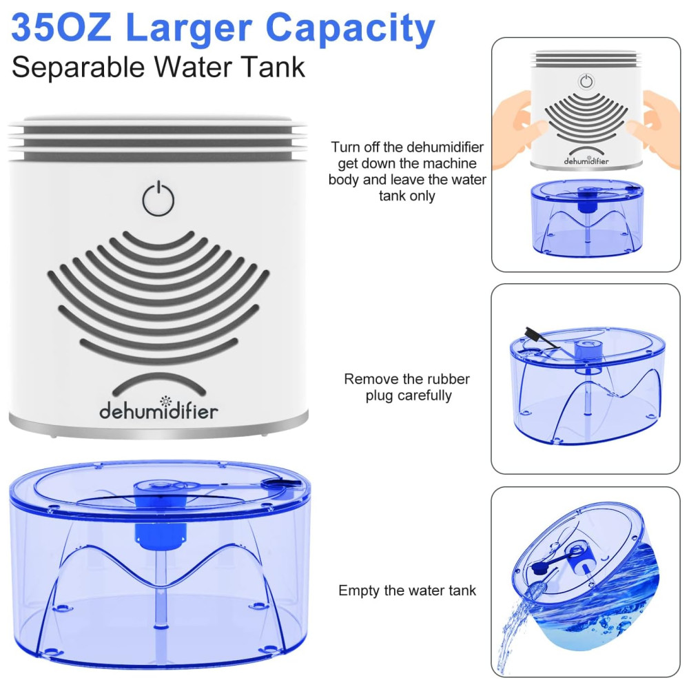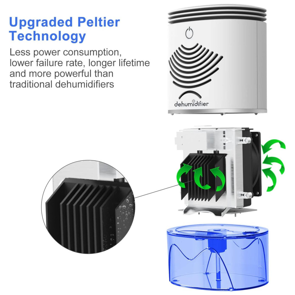 Desumidificação de alta eficiência O desumidificador usa a tecnologia de resfriamento termoelétrico para extrair a umidade de um ambiente úmido e coletá la no tanque equipado de 35 onças , 1000 ml, que é ideal para salas de até 26 metros quadrados. Você pode ver o efeito depois de ligar o nosso mini desumidificador, o ar à sua volta ficará mais confortável e saudável.