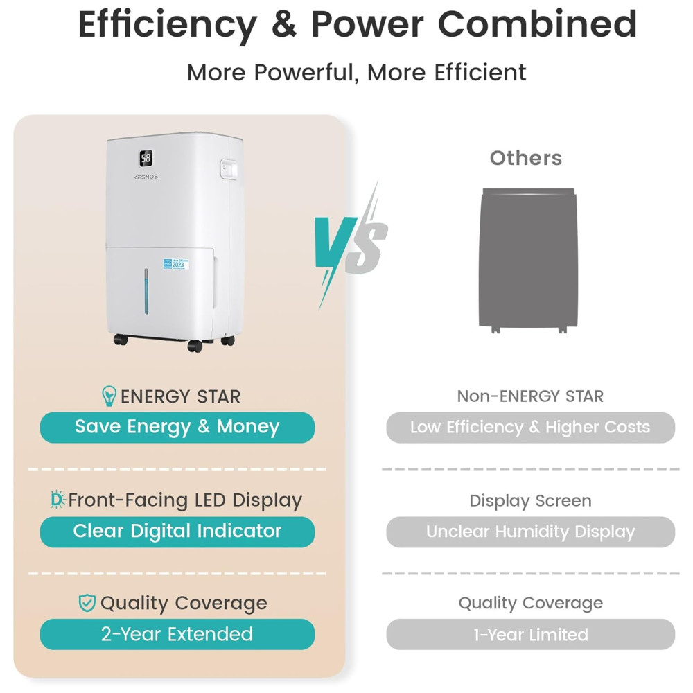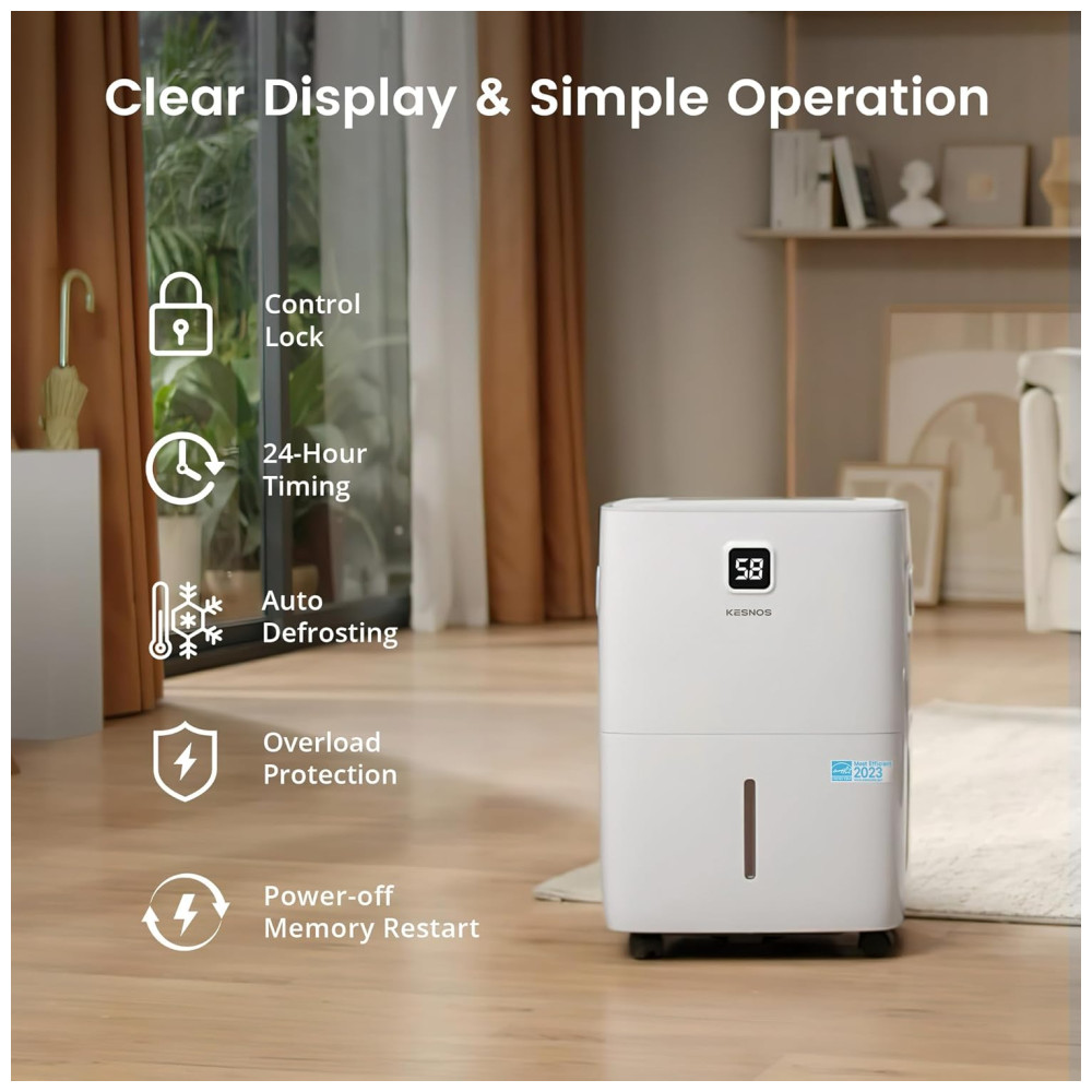 O Desumidificador Kesnos é altamente eficiente, removendo até 37,85 litros de umidade por dia em condições de 35°C e 90% de umidade, abrangendo áreas de até 511 m². Com ajuste de umidade de 30 a 80%, oferece conforto ideal, superando muitos desumidificadores domésticos. Certificado pela Energy Star, economiza até 45% de energia, o que pode resultar em uma economia significativa. Possui display inteligente para controle fácil, funcionamento silencioso, design versátil com opções de drenagem manual ou contínua, fácil mobilidade devido às rodas giratórias e alça oculta.