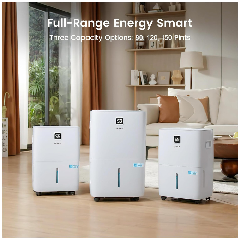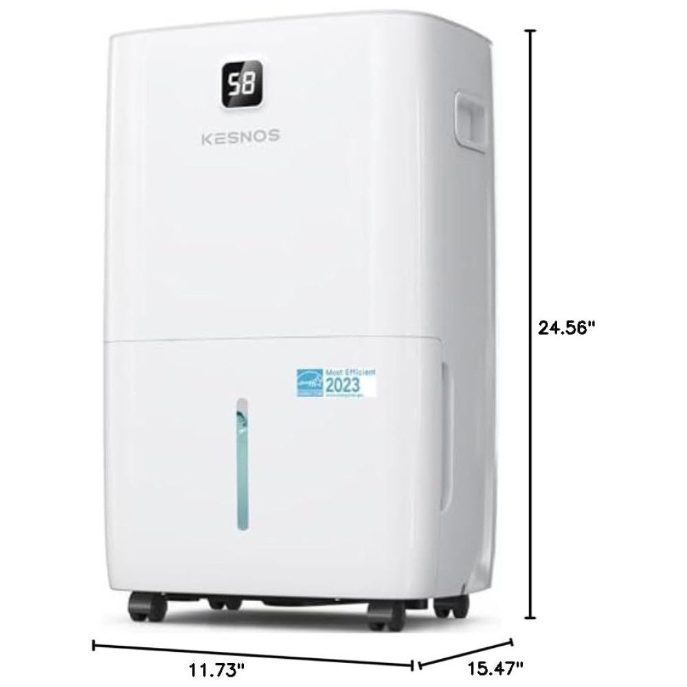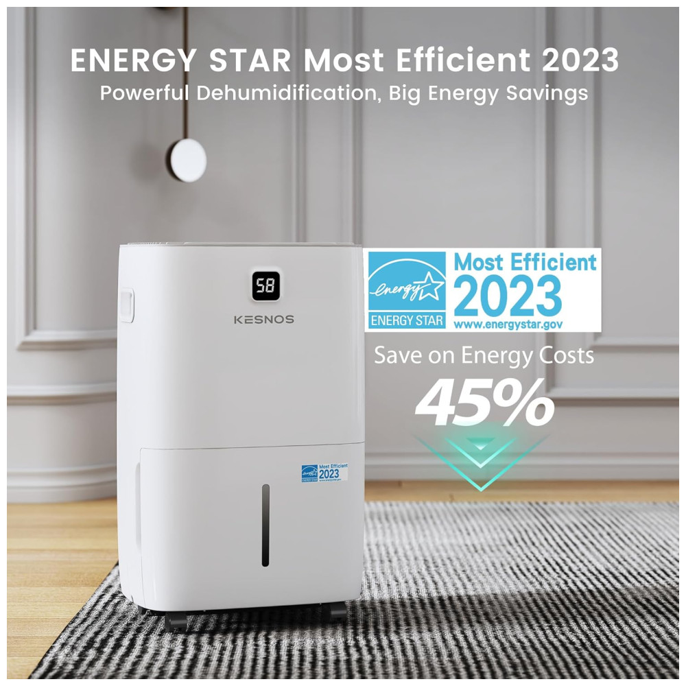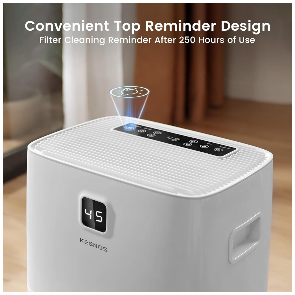 O Desumidificador Kesnos de alta eficiência é capaz de desumidificar no máximo 70,97 litros de umidade por dia em condições de 35°C e 90% de umidade relativa, cobrindo espaços de até 696 m². Este desumidificador permite ajustar os níveis de umidade de 30% a 80% para garantir conforto ideal, superando a maioria dos desumidificadores domésticos. Certificado pela Energy Star, ele reduz o consumo de energia em até 45%, economizando até 857,6 em contas de eletricidade anualmente. Com display frontal para controle fácil e preciso, o desumidificador conta com a função MIRAGE que oferece a opção de desligar o visor sem interromper a operação. Além disso, opera de forma silenciosa, com um nível de ruído de apenas 45 dB. Possui diversas opções de drenagem, tanque de água de 8 litros e mangueira de 1 metro inclusa, além de rodízios e alça ergonômica para fácil mobilidade. Projetado com organizador de cabos oculto para maior conforto do usuário. Um produto que une eficiência, economia e praticidade, garantindo um ambiente saudável e confortável.