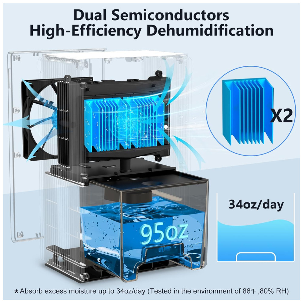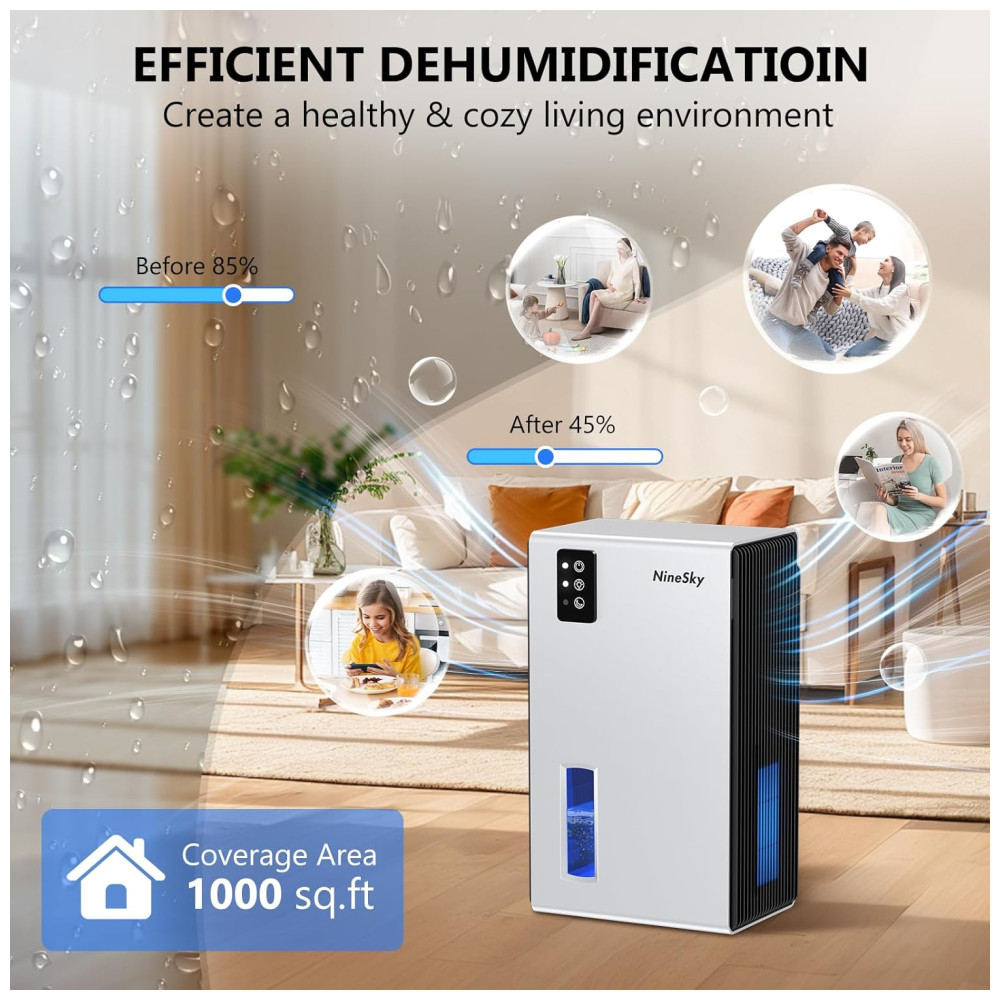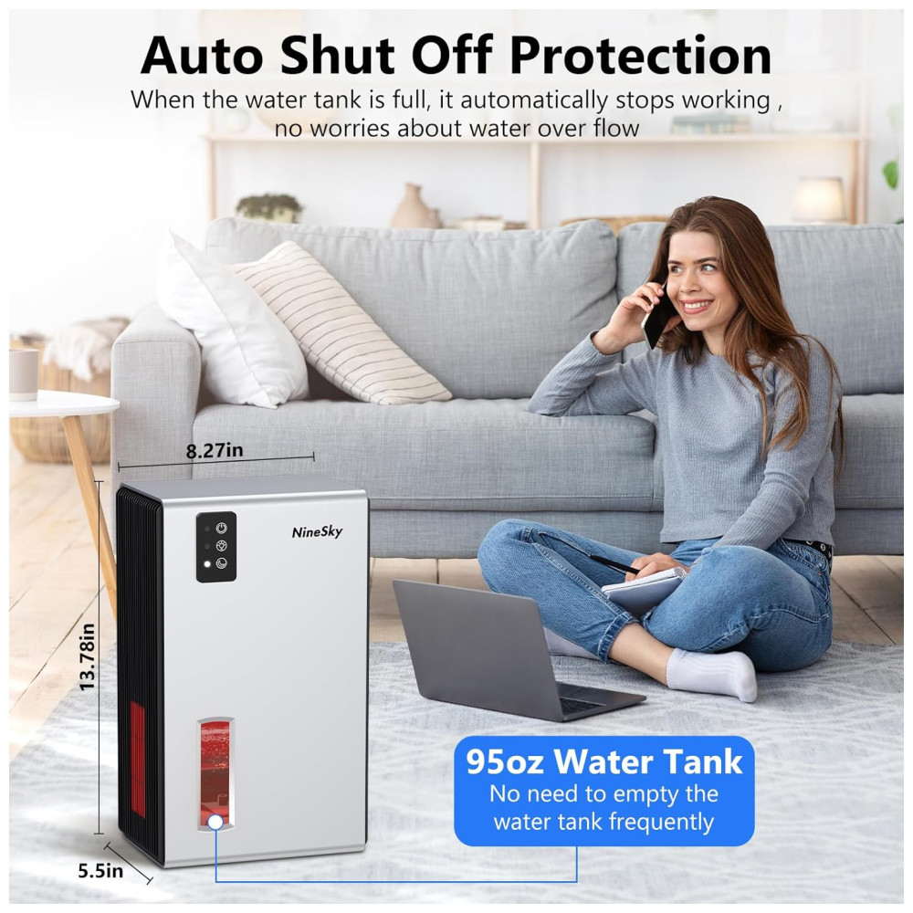 Desligamento Automático: Desumidificador inteligente com função de desligamento automático quando o tanque de água está cheio ou na posição errada, perfeito para evitar que a água transborde quando você não percebeu, muito e conveniente de usar quando você não está em casa.