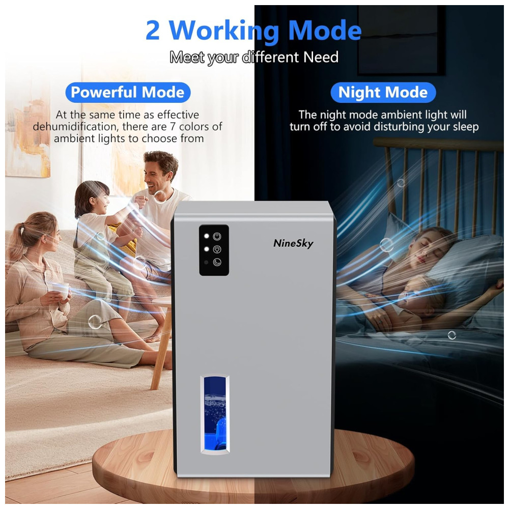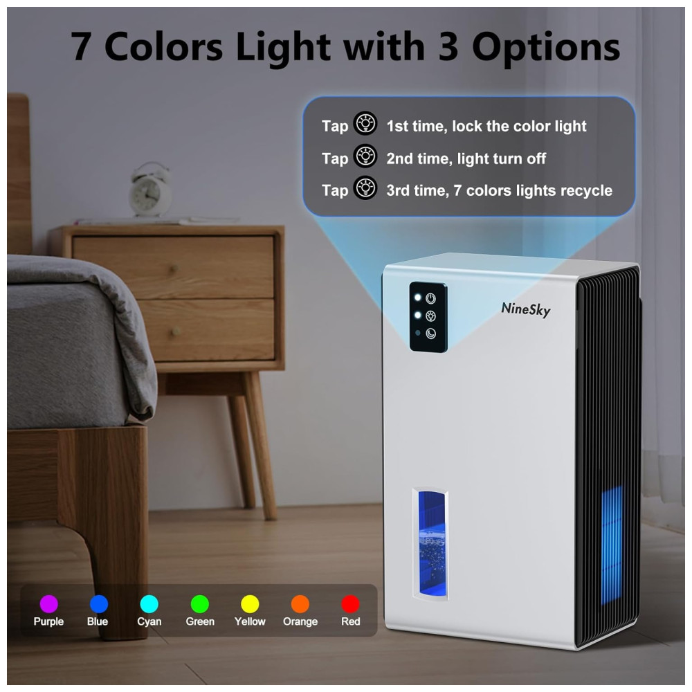 7 Luzes Noturnas Coloridas: Nosso desumidificador para quarto tem 7 luzes variáveis, que podem ser definidas de acordo com sua cor preferida, podem servir como uma luz noturna, criando uma atmosfera de sono doce e romântica para você.
