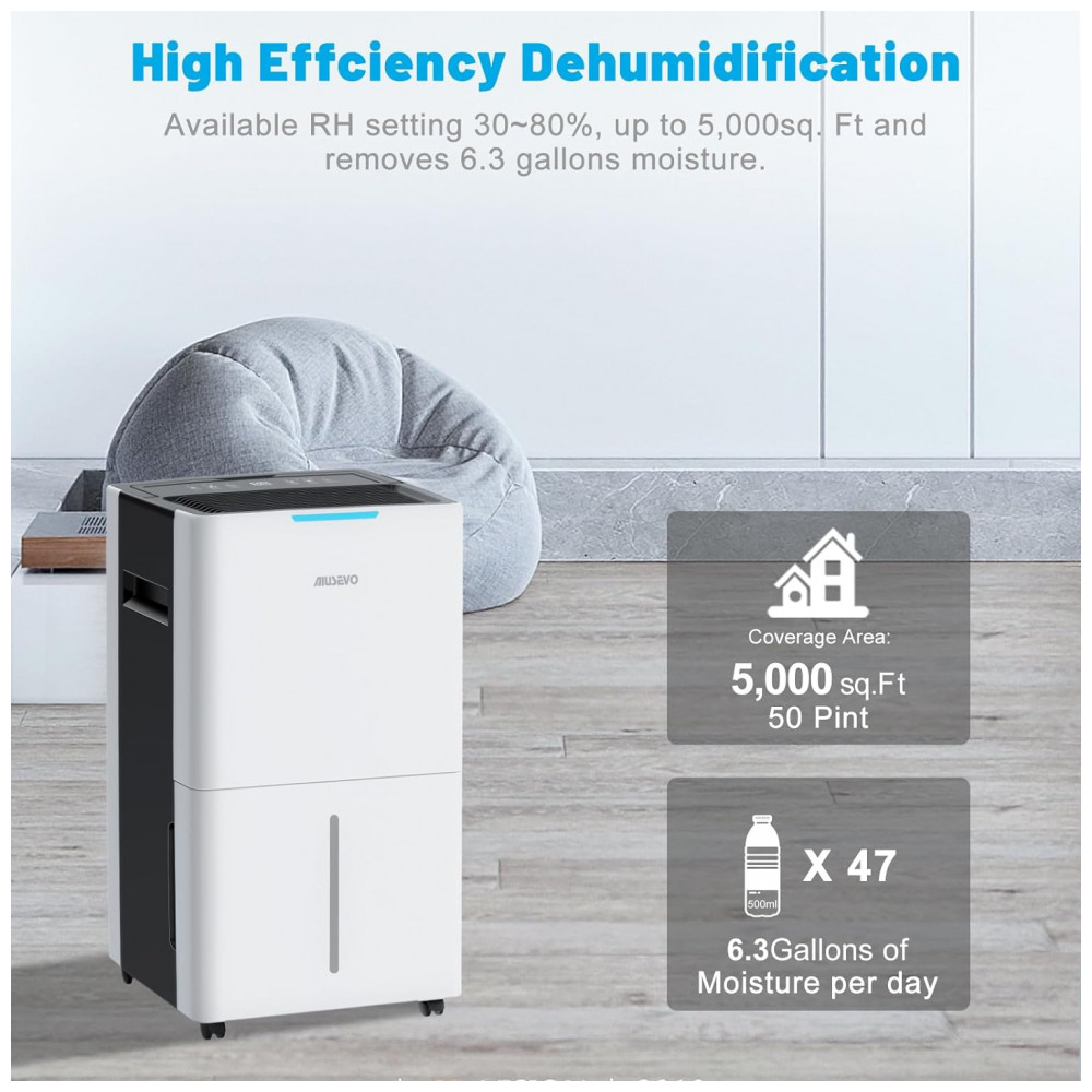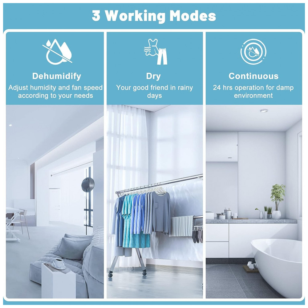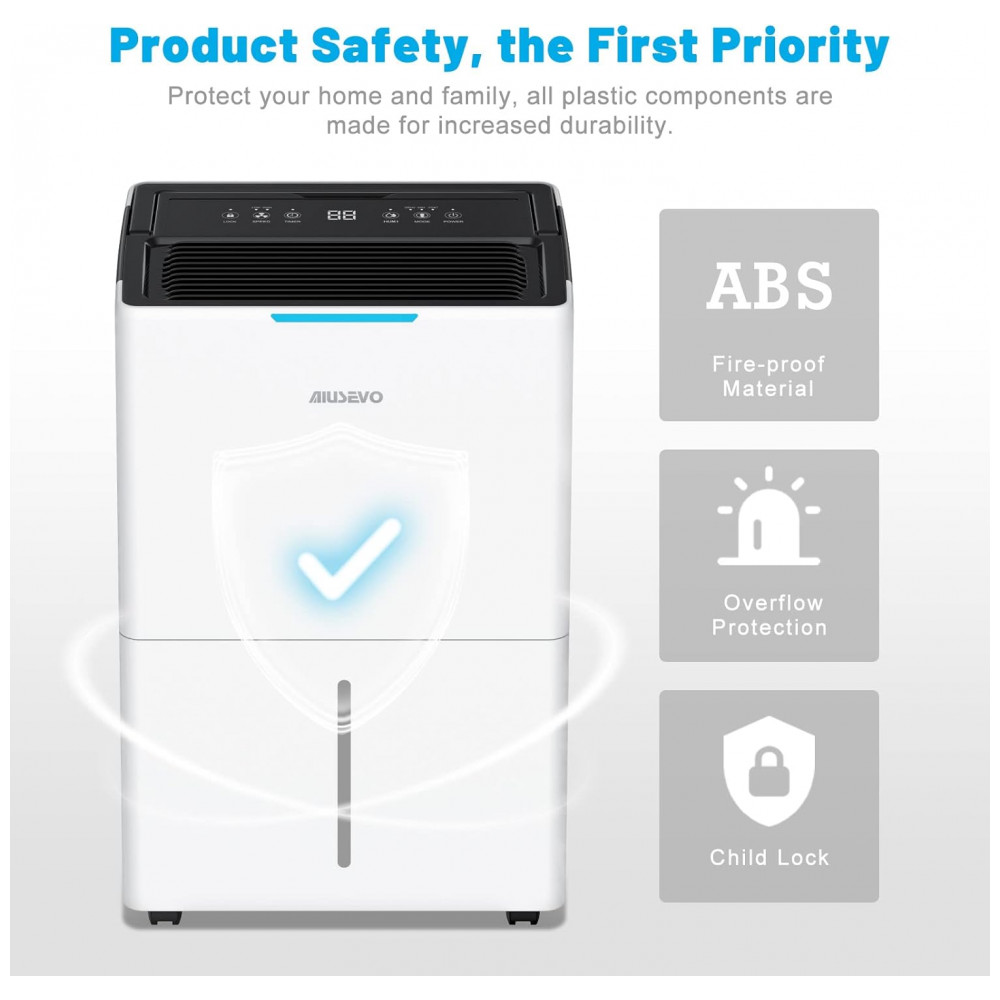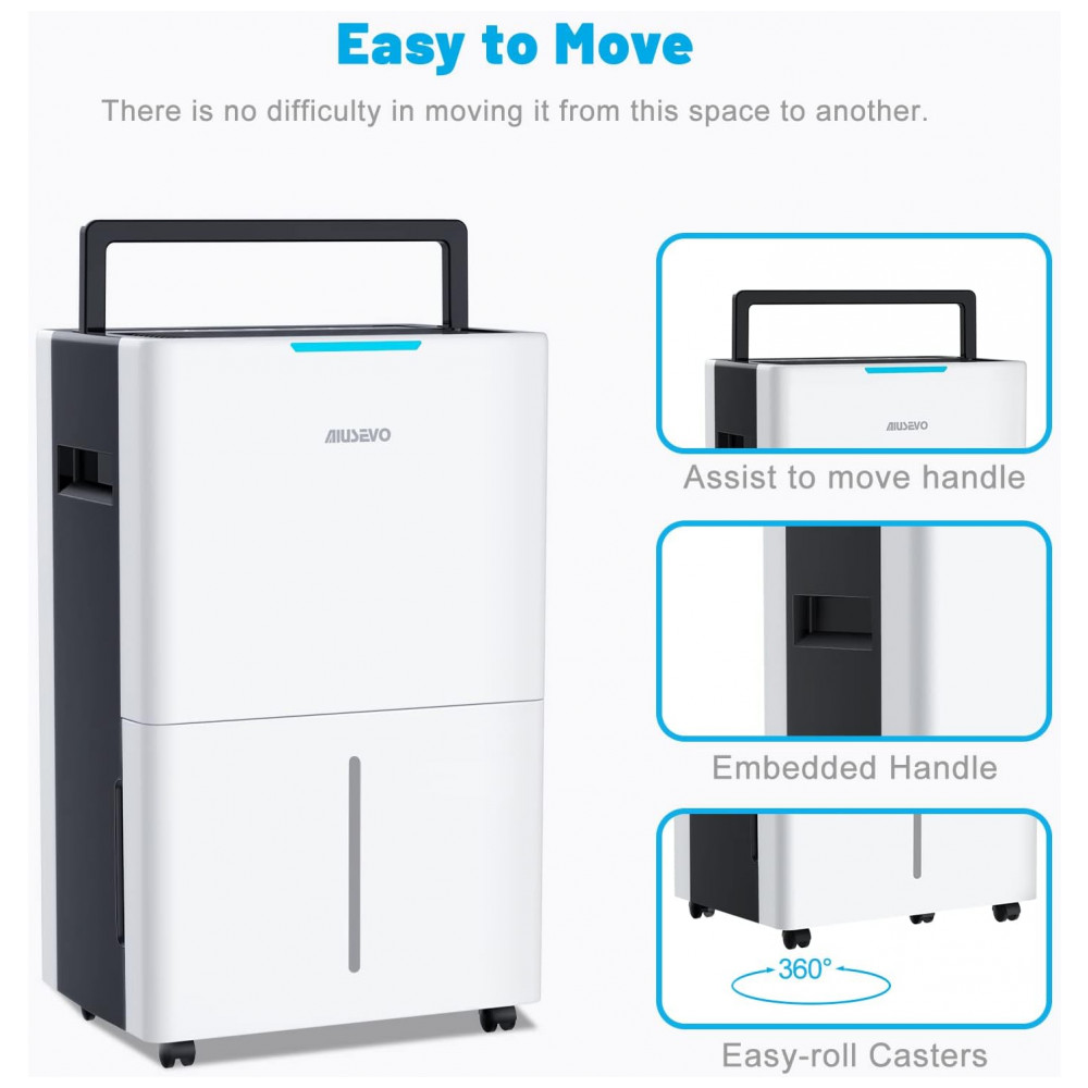PROTEÇÃO DE TRANSBORDAMENTO E PORTÁTIL Uso que a unidade desliga automaticamente quando o balde de água está cheio. A luz indicadora piscará e a campainha soará por alguns segundos. Com um design elegante e humano, o desumidificador possui rodas convenientes e dois tipos de alças de transporte ideais para sua casa, escritório, porão ou quarto.