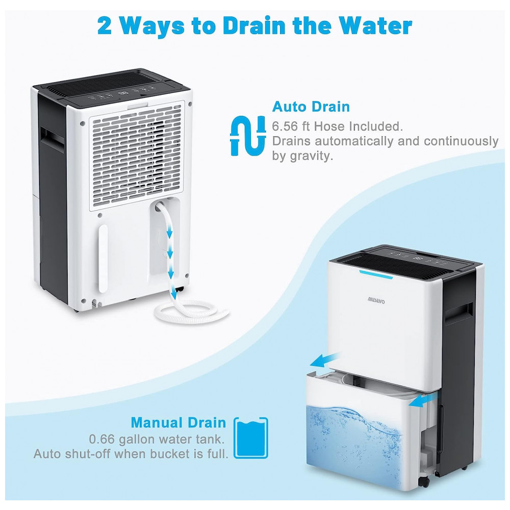DUAS FORMAS FÁCEIS DE DRENAGEM O desumidificador possui um design de tanque de água frontal de 2.5 Litros que permite que você veja a água coletada. O desumidificador parará automaticamente de funcionar quando terminar e você poderá esvaziar a água manualmente. Nosso desumidificador vem com uma mangueira de drenagem de que você pode conectar facilmente à saída do desumidificador para drenagem contínua