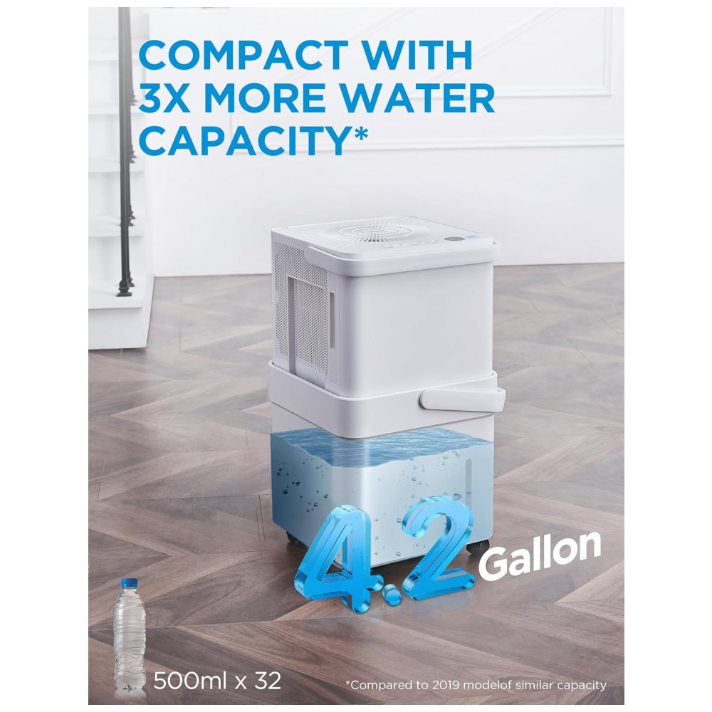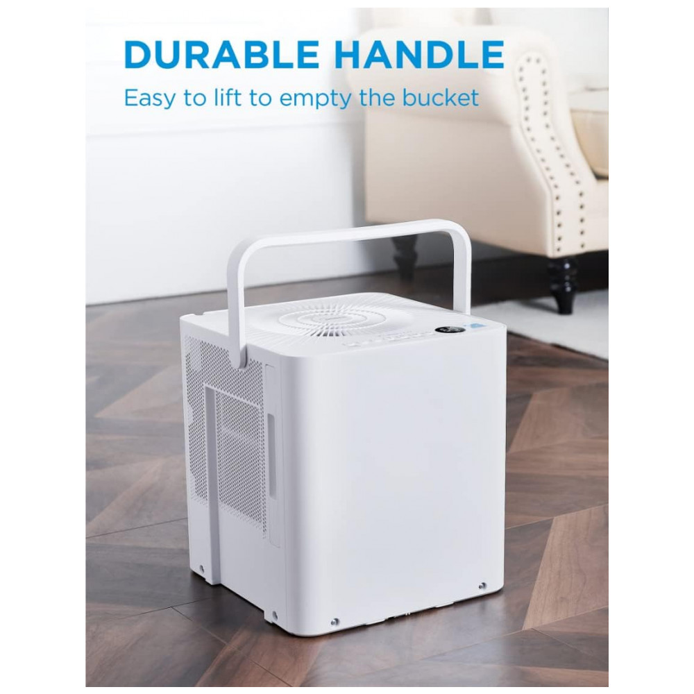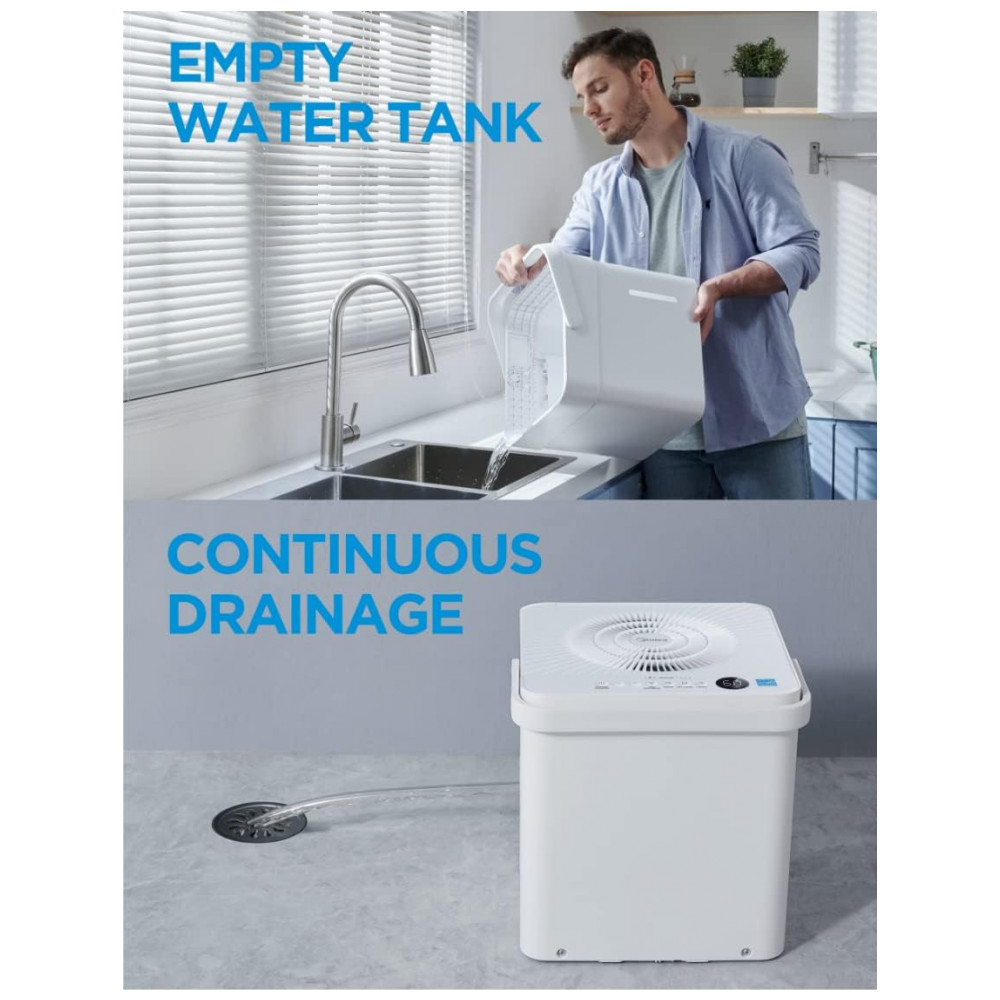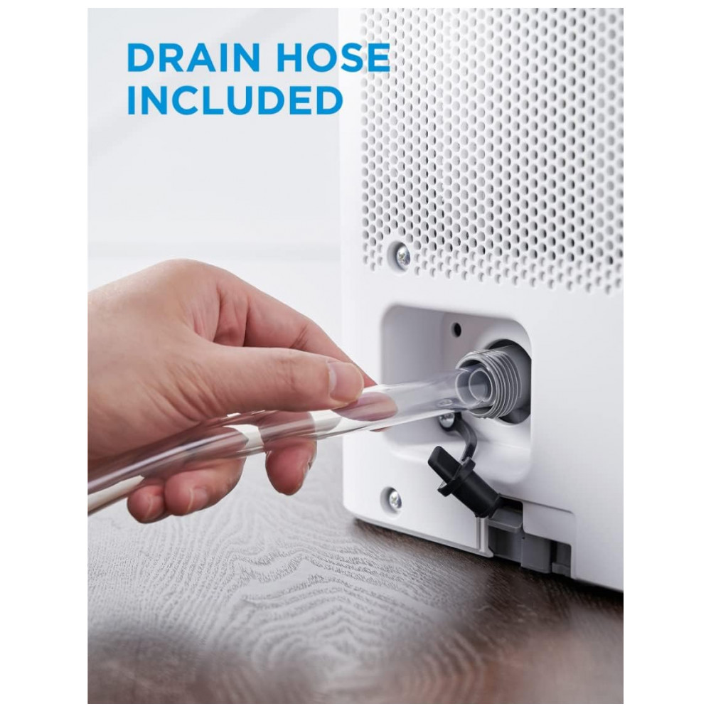 DEFINA E ESQUEÇA A opção versátil e sem balde oferece mais flexibilidade para remover a umidade. Você pode remover o tanque de água e colocar a unidade acima da pia usando a mangueira de drenagem incluída ou posicioná la sobre um ralo no chão, perto de uma janela ou porta.
