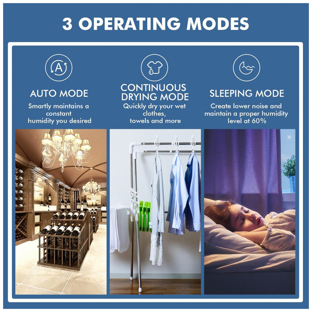 3 modos de operação e 2 velocidades do ventilador 1. Modo automático mantém de forma inteligente a umidade constante desejada 2. Modo de secagem contínua seca rapidamente suas roupas molhadas, toalhas e muito mais 3. Modo de dormir cria ruído mais baixo e mantém um nível de umidade adequado em 60. Além disso, a velocidade do ventilador tem 2 níveis ajustáveis alto, baixo.