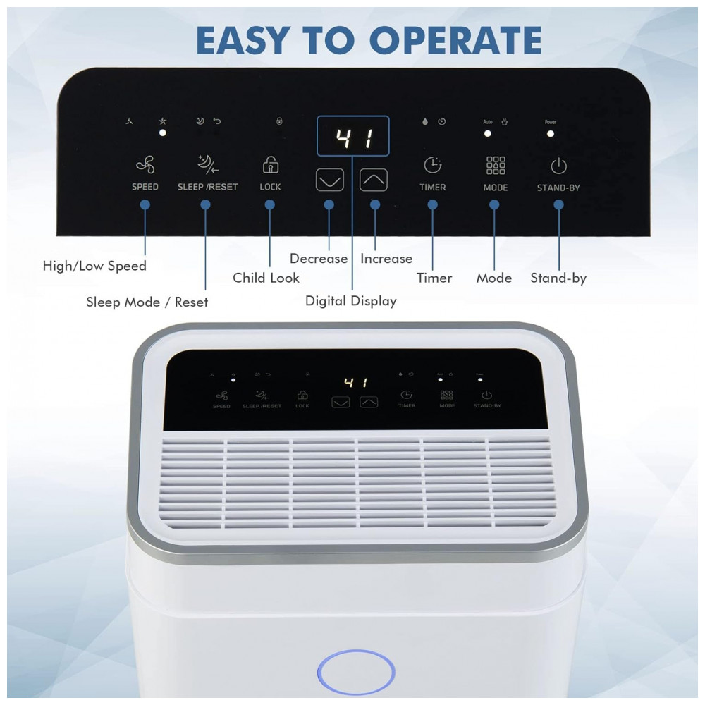 Fácil e de operar Com o painel de controle de toque LED inteligente, você pode definir facilmente o modo, a velocidade, o cronômetro e o nível de umidade desejado entre 30 e 80. As luzes indicadoras de 3 cores podem mostrar a umidade atual azul 65. Além disso, o bloqueio para crianças pode proteger seus filhos de possíveis danos.