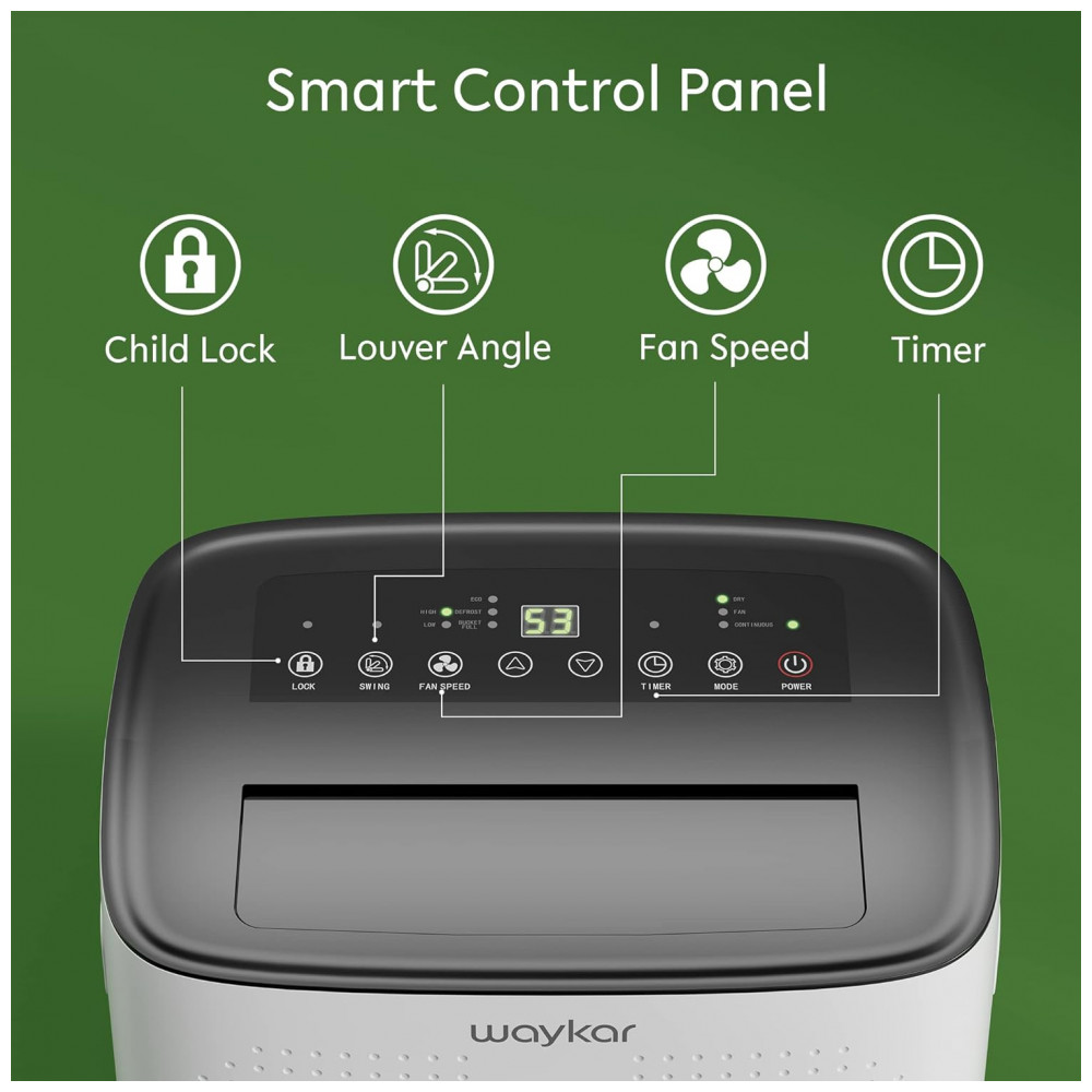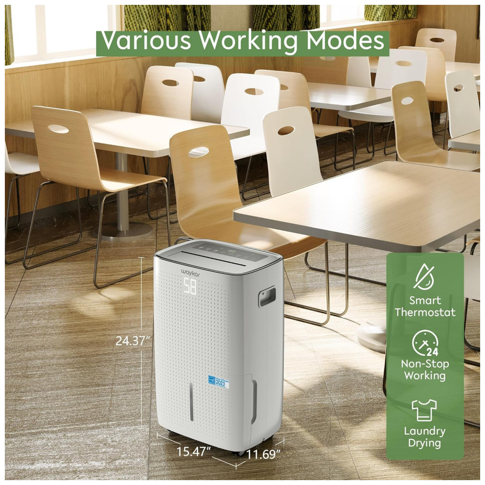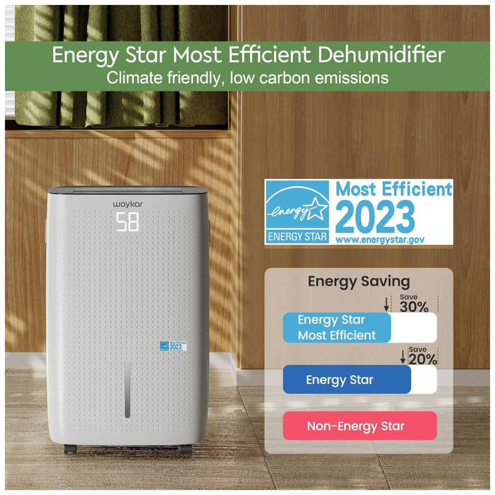 HUMIDISTAT INTELIGENTE COM ENERGY STAR O desumidificador com certificação Waykar ENERGY STAR reduz seu incômodo com a energia mantendo uma umidade ambiente ideal, para absorver a umidade de forma rápida e eficaz sem aumentar sua conta de energia. Um ventilador oscilante de 90 com velocidades altas, baixas cobre todo o ambiente e ajuda a secar o local com eficiência. O descongelamento automático permite ainda que a unidade tenha um bom desempenho, mesmo em condições de frio.